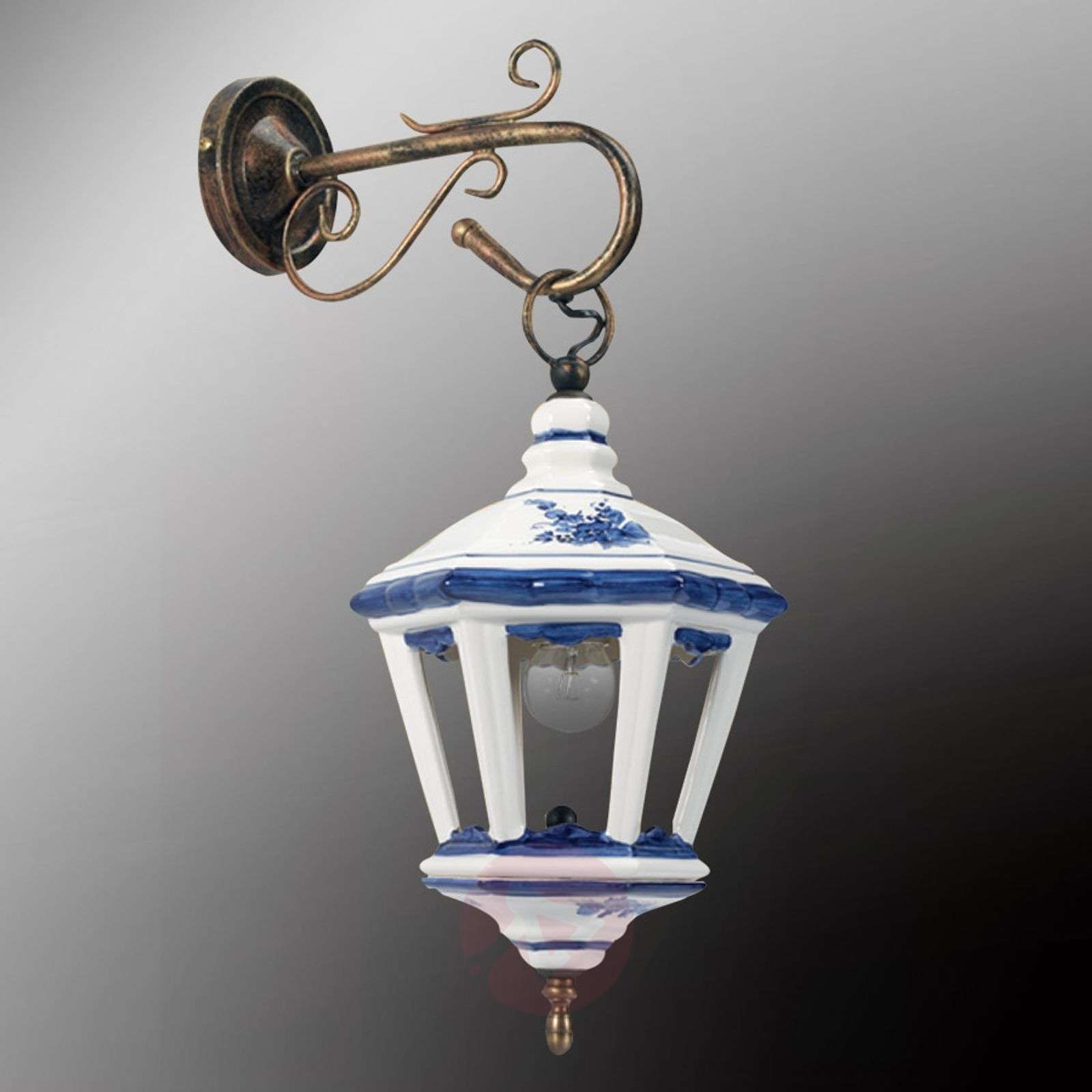 Latarenka z ceramiki – lampa ścienna VIOLA Lampa ścienna VIOLA z ceramiki stanie się wyjątkową dekoracją w każdym wnętrzu o rustykalnym wystroju. Na żelaznym zamocowaniu w miedziano-złotym kolorze umieszczony został pięknie uformowany, ceramiczny klosz w kształcie latarenki ozdobiony niebieskim wzorem, który daje łagodne światło, tworząc w pomieszczeniu nastrojową atmosferę. Lampa pasuje zarówno do wnętrz utrzymanych w stylu śródziemnomorskim, jak i dworkowo-rustykalnym. Wyłącznie do użytku wewnątrz. Klasa efektywności energetycznej: A++