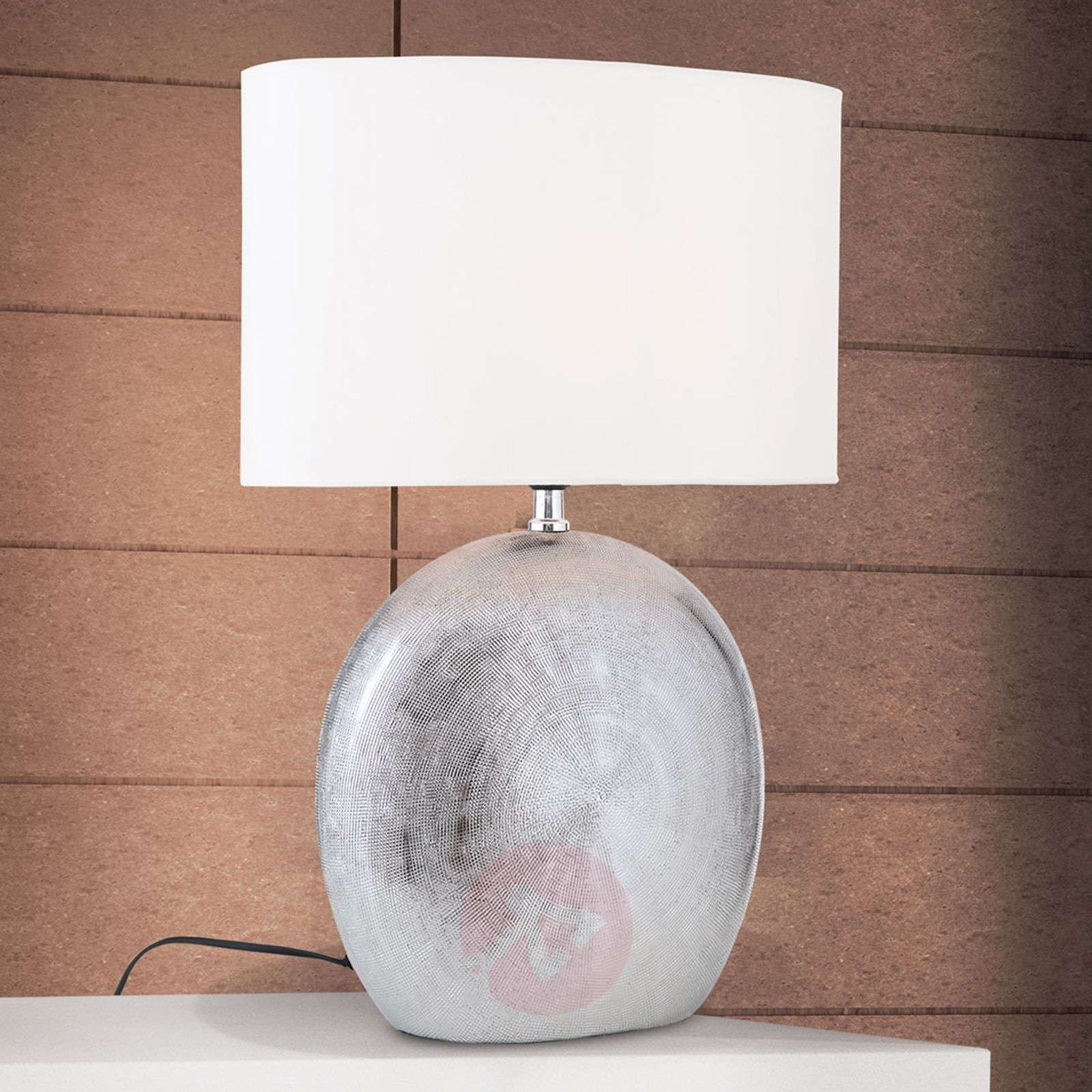 Ekstrawagancka lampa stołowa Ethno z dekoracyjną podstawą z ceramiki Lampa stołowa Ethno jest modnym akcesorium oświetleniowym, które nie tylko zapewnia atmosferyczne dodatkowe oświetlenie, ale ma również wysoką wartość dekoracyjną. Jej tekstylny klosz pozostaje w ekstrawaganckim kontraście z podstawą, zarówno pod względem materiału, jak i kolorystyki. Na ceramicznej podstawie po włączeniu oświetlenia pojawia się delikatny wzór. Prawdziwy hit w nowoczesnych wnętrzach! Klasa efektywności energetycznej: A++