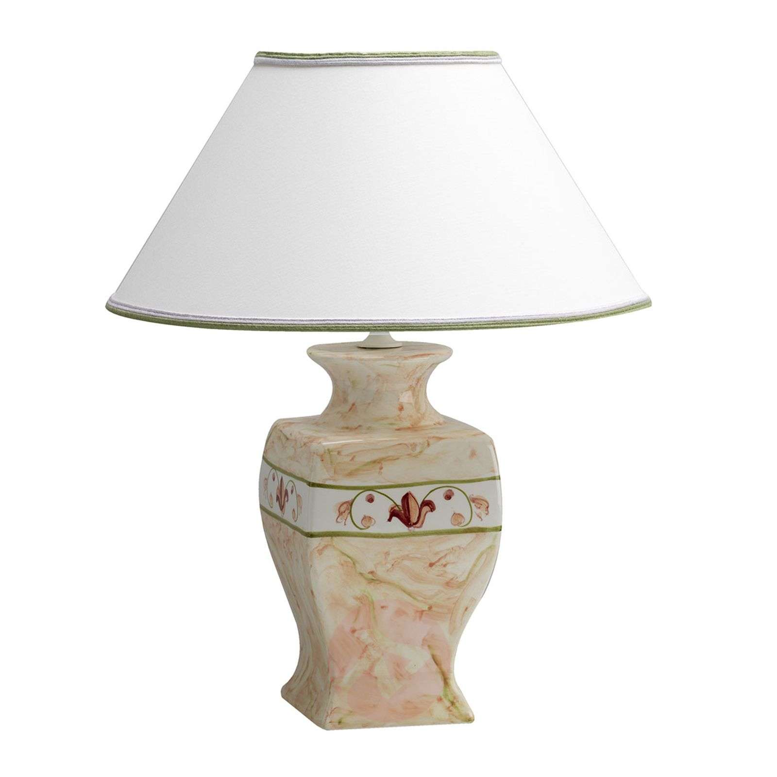 Lampa stołowa MARMORINO – fascynujące źródło światła Lampa stołowa MARMORINO z ceramiczną podstawą zachwyca przyjemną dla oka kolorystyką. Biała, ceramiczna podstawa jest ozdobiona efektem marmurowym w kolorach antycznego różu i zielonym oraz dekoracyjnym, białym paskiem z kwiatowym motywem w górnej części. Biały abażur z materiału posiada zielone oblamowanie na obu brzegach i zapewnia nastrojowe światło dodatkowe, które idealnie nadaje się do salonu lub sieni i wejść do budynków. Klasa efektywności energetycznej: A++