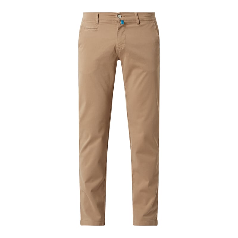Chinosy męskie Pierre Cardin, Mieszanka bawełny z dodatkiem streczu , Krój tapered fit , ‘Futureflex’, Zapięcie na guzik i zamek błyskawiczny , Kieszonka na monety z wypustką, Wpuszczane kieszenie w stylu francuskim , Lamowane kieszenie z tyłu zapinane na guzik, Długość wewnętrzna nogawki w rozmiarze 32/32: 80 cm , Szerokość w pasie w rozmiarze 32/32: 84 cm