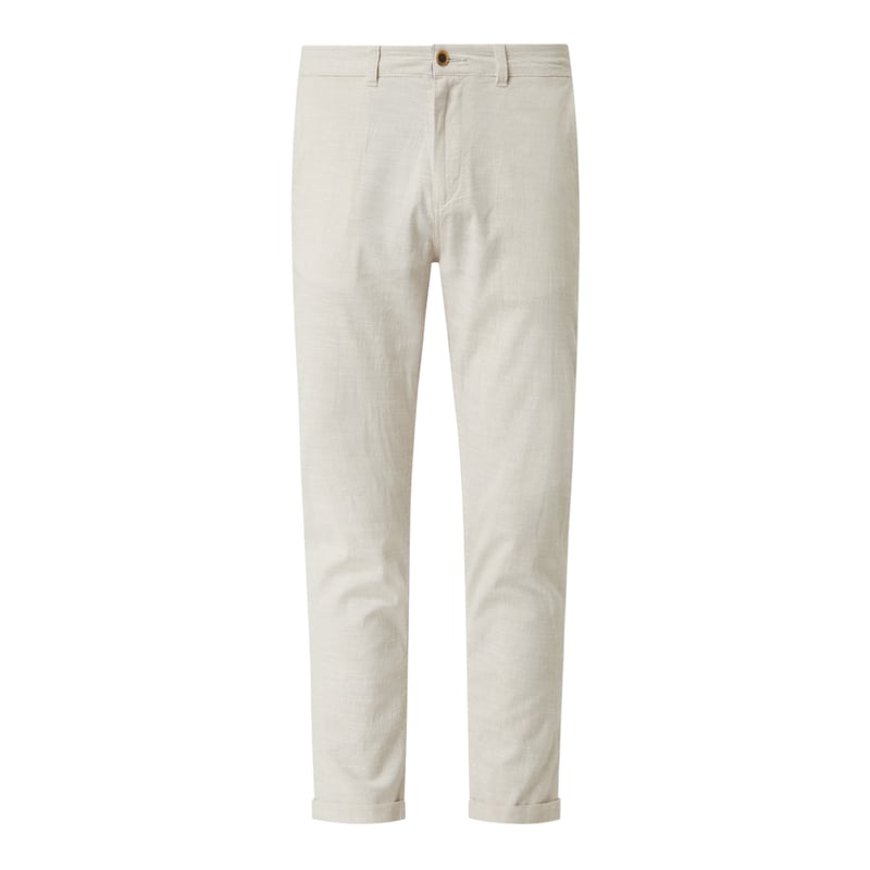 Chinosy męskie JACK & JONES, Mieszanka bawełny z dodatkiem lnu i streczu , Zwężana nogawka, Zapięcie na guzik i zamek błyskawiczny , Wpuszczane kieszenie w stylu francuskim , Kieszonka na monety, Kieszeń z wypustką na guzik , Długość wewnętrzna nogawki w rozmiarze 31/32: 70 cm, Szerokość w pasie w rozmiarze 31/32: 84 cm