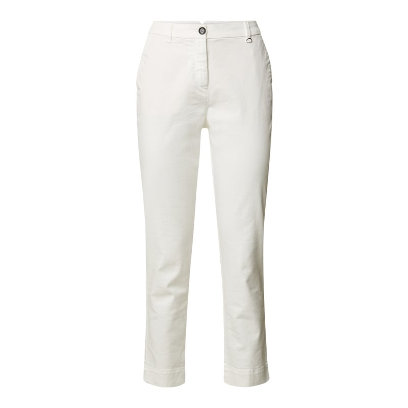 Chinosy damskie Marc Cain, Mieszanka bawełny z dodatkiem streczu, Dopasowany krój, Zapięcie na guzik i zamek błyskawiczny, Boczne wpuszczane kieszenie, Zaznaczone kieszenie z tyłu, Długość 7/8, Szerokość w pasie w rozmiarze 36: 39 cm, Długość wewnętrzna nogawki w rozmiarze 36: 69 cm