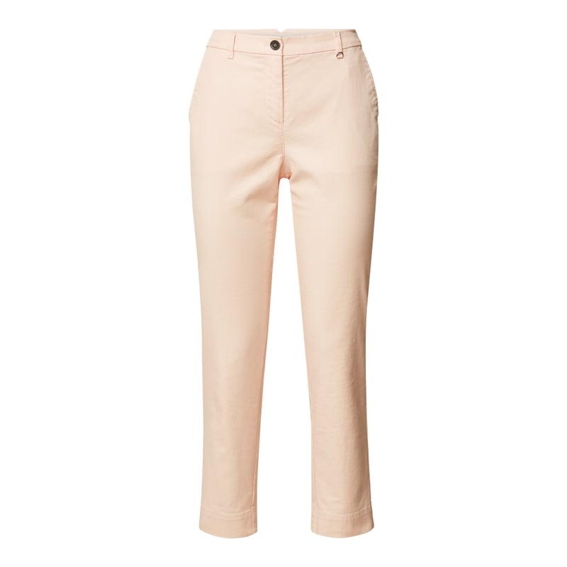 Chinosy damskie Marc Cain, Mieszanka bawełny z dodatkiem streczu, Dopasowany krój, Zapięcie na guzik i zamek błyskawiczny, Boczne wpuszczane kieszenie, Zaznaczone kieszenie z tyłu, Długość 7/8, Szerokość w pasie w rozmiarze 36: 39 cm, Długość wewnętrzna nogawki w rozmiarze 36: 69 cm