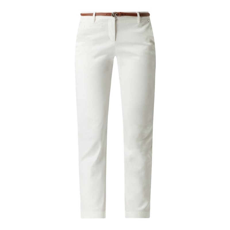 Chinosy damskie comma, Mieszanka bawełny z dodatkiem streczu, Zwężana nogawka , Zapięcie na haftkę, guzik i zamek błyskawiczny, Pasek ze sprzączką , Wpuszczane kieszenie w stylu francuskim, Ozdobne wypustki z tyłu, Logo, Długość wewnętrzna nogawki w rozmiarze 36: 70 cm, Szerokość w pasie w rozmiarze 36: 74 cm