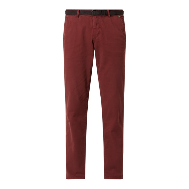 Chinosy męskie LERROS, Mieszanka bawełny i elastanu , Zwężana nogawka, Zapięcie na guzik i zamek błyskawiczny , Wpuszczane kieszenie w stylu francuskim , Tylne kieszenie z wypustką zapinane na guzik , Naszywka z logo , Pasek ze sprzączką, Długość wewnętrzna nogawki w rozmiarze M: 78,5 cm , Szerokość w pasie w rozmiarze M: 85 cm