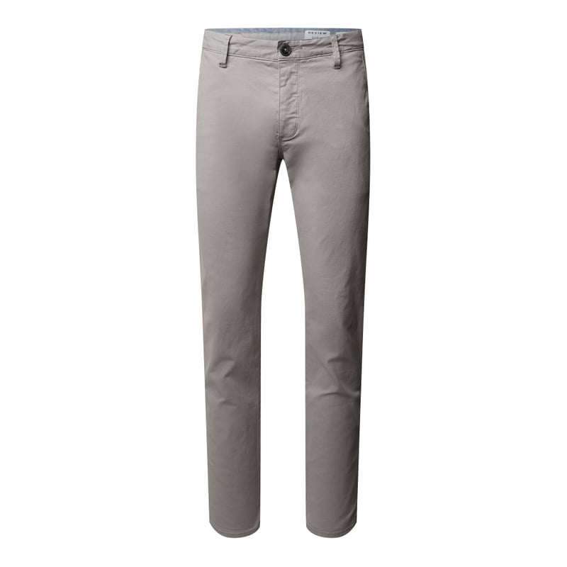 Chinosy męskie REVIEW, Mieszanka bawełny i elastanu, Nogawka o prostym kroju, Listwa guzikowa, Wpuszczane kieszenie w stylu francuskim, Dwie tylne kieszenie z wypustką, Naszywka z logo w pasie, Pasek ze sprzączką, Długość wewnętrzna nogawki w rozmiarze M: 83,5 cm , Szerokość w pasie w rozmiarze M: 86 cm