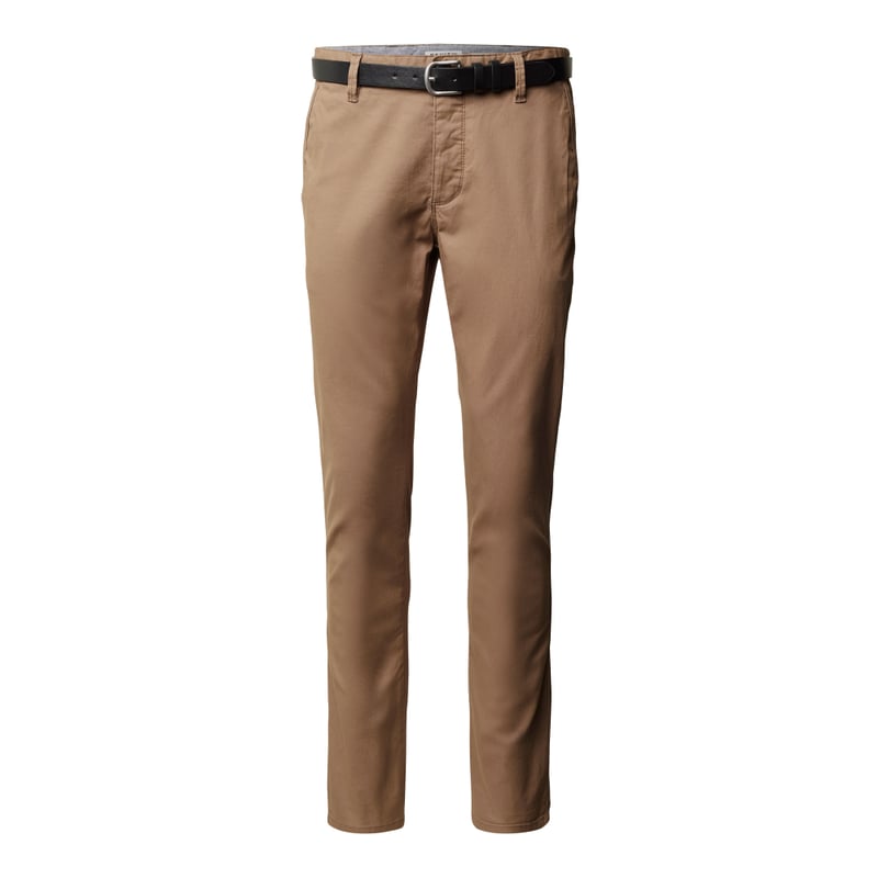 Chinosy męskie REVIEW, Mieszanka bawełny i elastanu, Nogawka o prostym kroju, Listwa guzikowa, Wpuszczane kieszenie w stylu francuskim, Dwie tylne kieszenie z wypustką, Naszywka z logo w pasie, Pasek ze sprzączką, Długość wewnętrzna nogawki w rozmiarze M: 83,5 cm , Szerokość w pasie w rozmiarze M: 86 cm