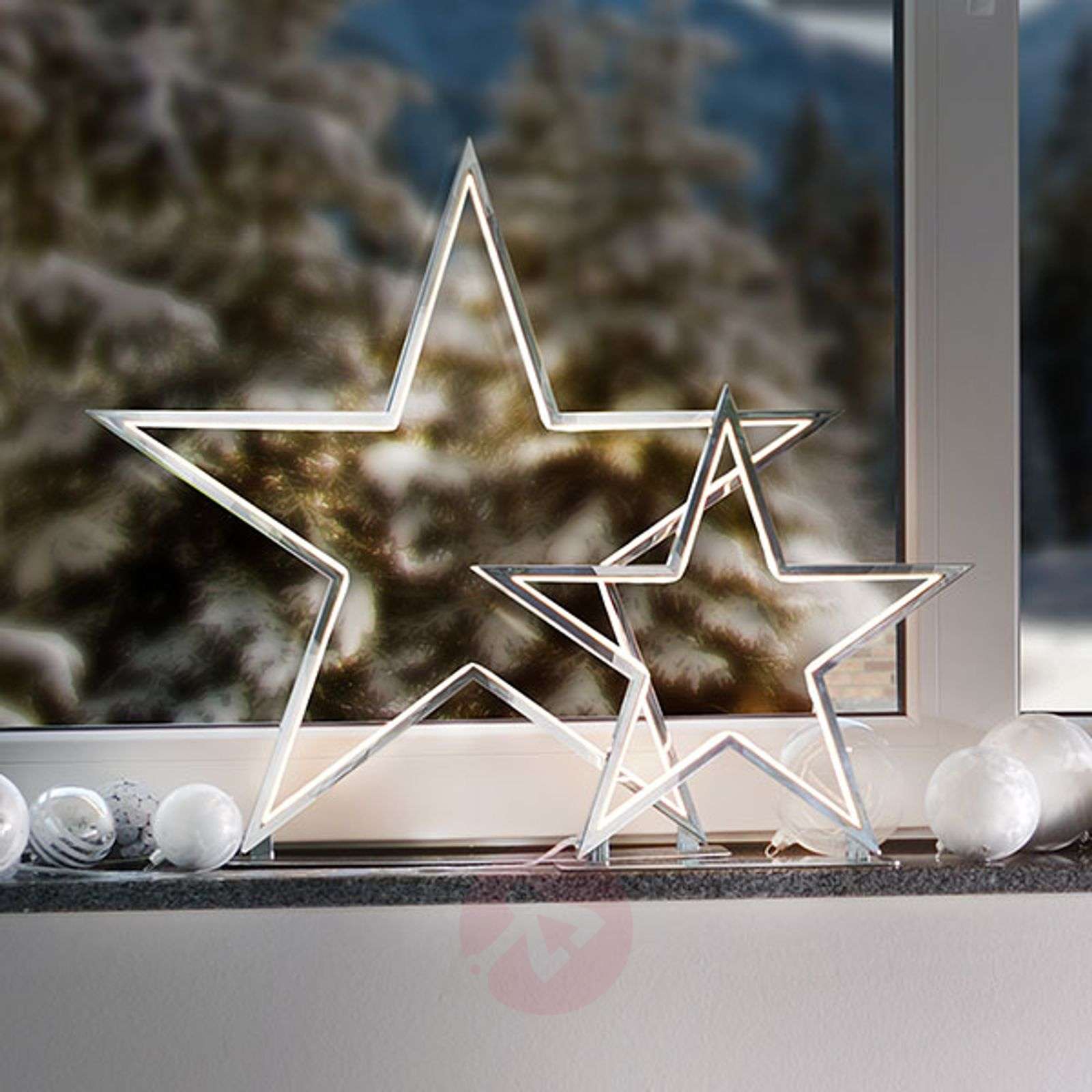 Błyszczące chromowane oświetlenie dekoracyjne Lucy w kształcie gwiazdy – 33 cm wysokości W przypadku lampy dekoracyjnej LED Lucy w kształcie gwiazdy lśniący blask gwarantuje nie chromowany metal, ale przytulne oświetlenie LED, które znajduje się po wewnętrznej stronie kantów lampy. Nastrojowe oświetlenie dekoracyjne, które sprawdzi się szczególnie jako bożonarodzeniowa dekoracja okienna lub ozdoba stołu. Prosty design pasuje do wielu stylów wnętrz. Wskazówka: oświetlenie dekoracyjne LED Lucy będzie wyglądać wyjątkowo atrakcyjnie w grupie po kilka sztuk. Klasa efektywności energetycznej: A+