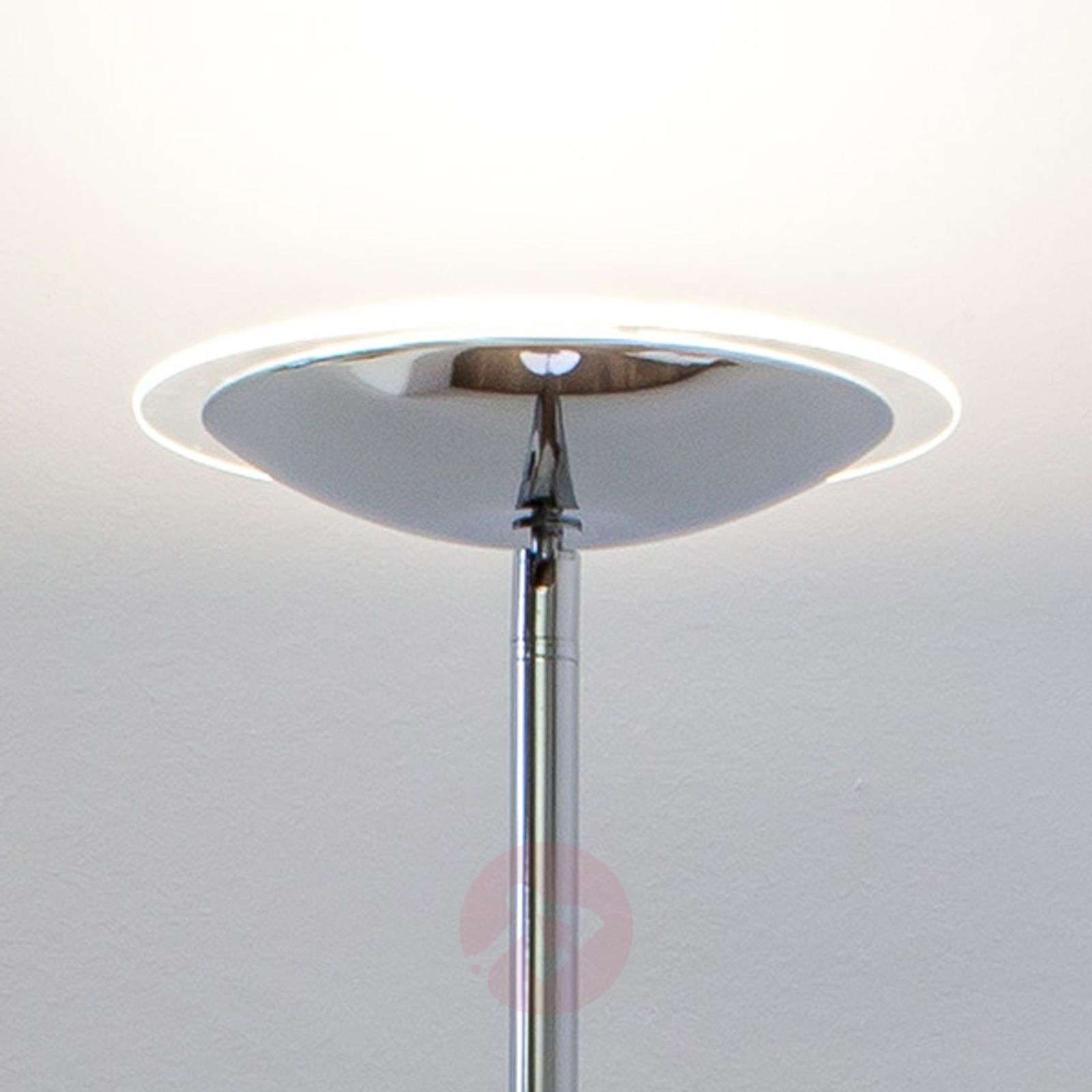 Ściemniana lampa oświetlająca sufit LED MALEA Lampa oświetlająca sufit LED MALEA odznacza się stosunkowo smukłym wyglądem, na który składają się podstawa i czasza wykonane z błyszczącego chromowanego metalu. Czaszę wieńczy lekko wystająca tafla z przezroczystego szkła, która doskonale współgra z pozostałymi elementami lampy. Subtelny kształt lampy MALEA czyni z niej ponadczasowy dodatek, który pasuje do wielu aranżacji. Dzięki zintegrowanemu ściemniaczowi można dostosować poziom jasności ciepłego białego światła w zależności od potrzeb, z kolei ruchoma głowica pozwala na skierowanie strumienia świetlnego w dowolnym kierunku. Włącznik wyposażony został w funkcję ściemniacza: Krótkie przyciśnięcie włącza lub wyłącza lampę, z kolei dłuższe przytrzymanie pozwala zmienić stopień jasności światła. Dodatkowa funkcja zapamiętywania przywraca ostatnio wybrane ustawienie jasności światła przy kolejnym włączeniu lampy. Głowicę lampy można obracać o 45°. Klasa efektywności energetycznej: A+