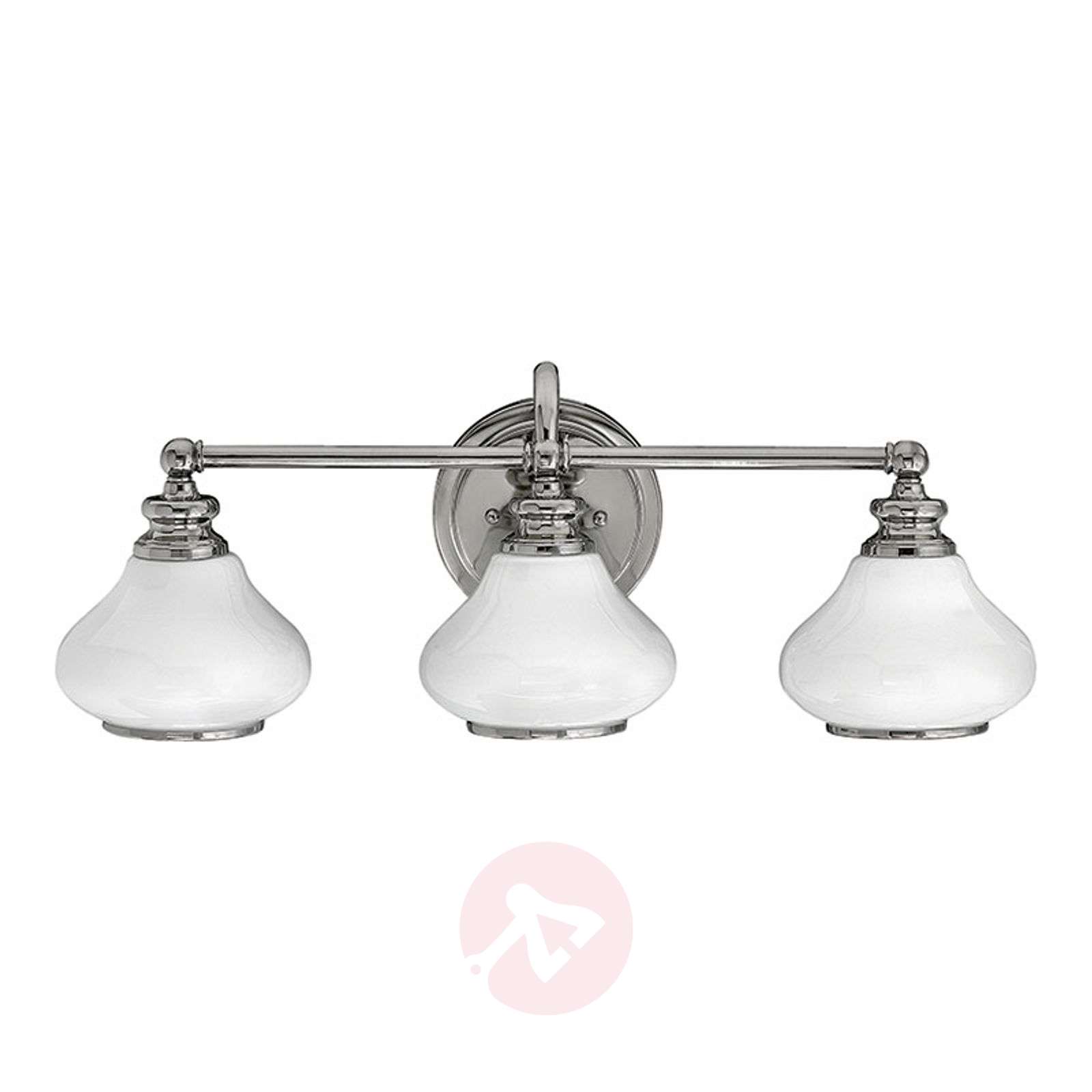 3-punktowa opalowa szklana lampa ścienna LED Ainsley, chromowana, do łazienki Kinkiet LED Ainsley, wykonany z opalowego szkła i opatrzony błyszczącym chromowaniem, mający trzy punkty emitujące światło, stanowi dekoracyjny a zarazem funkcjonalny element oświetleniowy nad większym lustrem w łazience. Dzięki stylowemu wzornictwu lampa emanuje atrakcyjnym urokiem retro i dlatego doskonale pasuje do łazienki stylizowanej na starą. Harmonijna całość powstaje tu szczególnie w połączeniu z marmurem i innymi szlachetnymi materiałami. Kinkiet LED Ainsley jest nie tylko niezwykle energooszczędny, ale również zapewnia odrobinę wyrafinowania w łazience. Ta zaś jest dobrze oświetlona dzięki trzem umieszczonym obok siebie źródłom światła. Z technicznego punktu widzenia lampa dostosowana do wilgotności powietrza panującej w łazience. Klasa efektywności energetycznej: A+