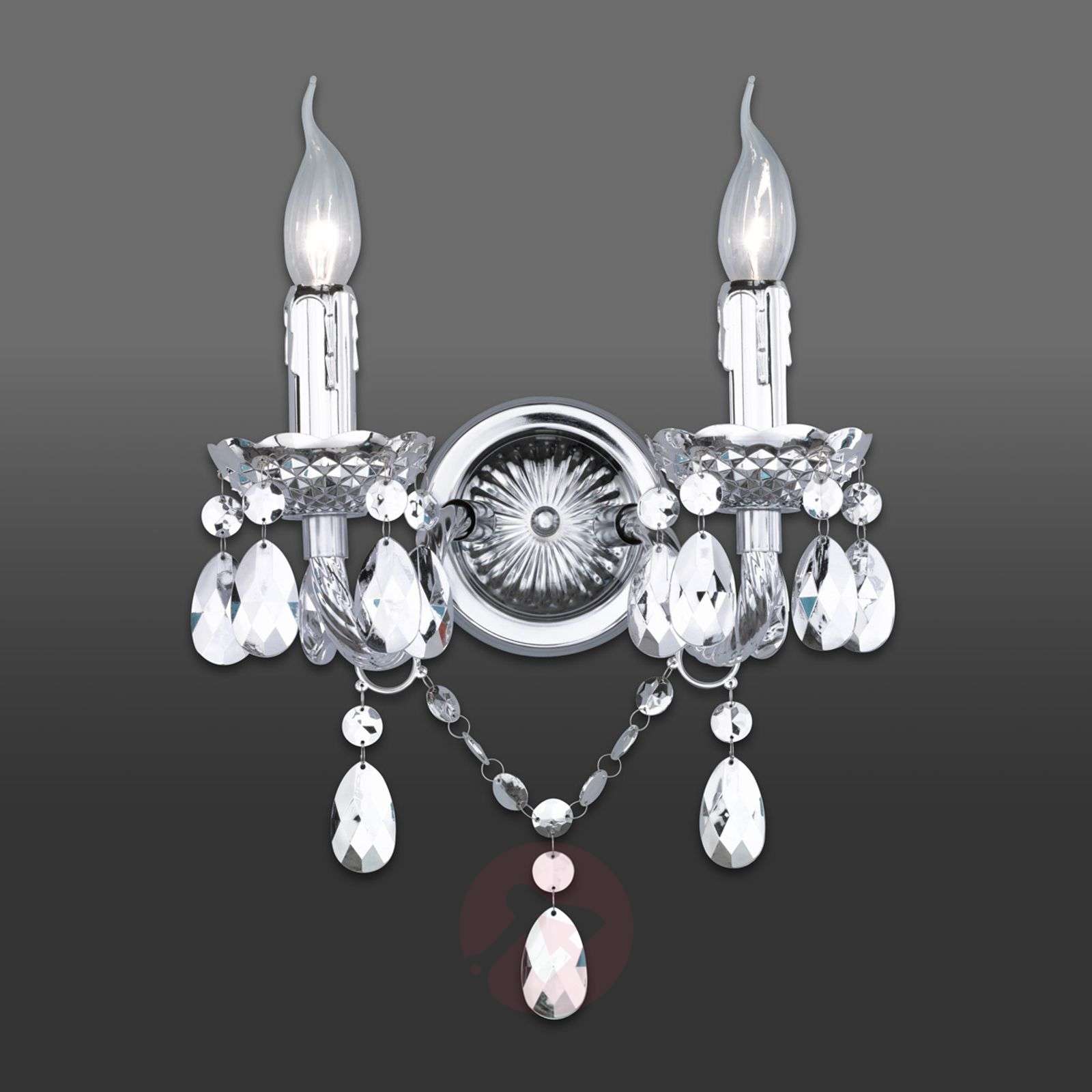 Dwupunktowa lampa ścienna PERDITA - idealny dodatek do ekstrawaganckiego wnętrza Lampa ścienna PERDITA odznacza się wytwornym designem: Ze względu na błyszczące, chromowane zamocowanie ścienne i piękne ozdoby w postaci chromowanych akrylowych elementów stanowi luksusowe źródło światła. Szczególnie atrakcyjnie wyglądać będzie z lampkami w kształcie świec. Ich światło sprawi, że zawieszki będą mienić się czarującymi refleksami. Żarówki nie są objęte dostawą. Klasa efektywności energetycznej: A++