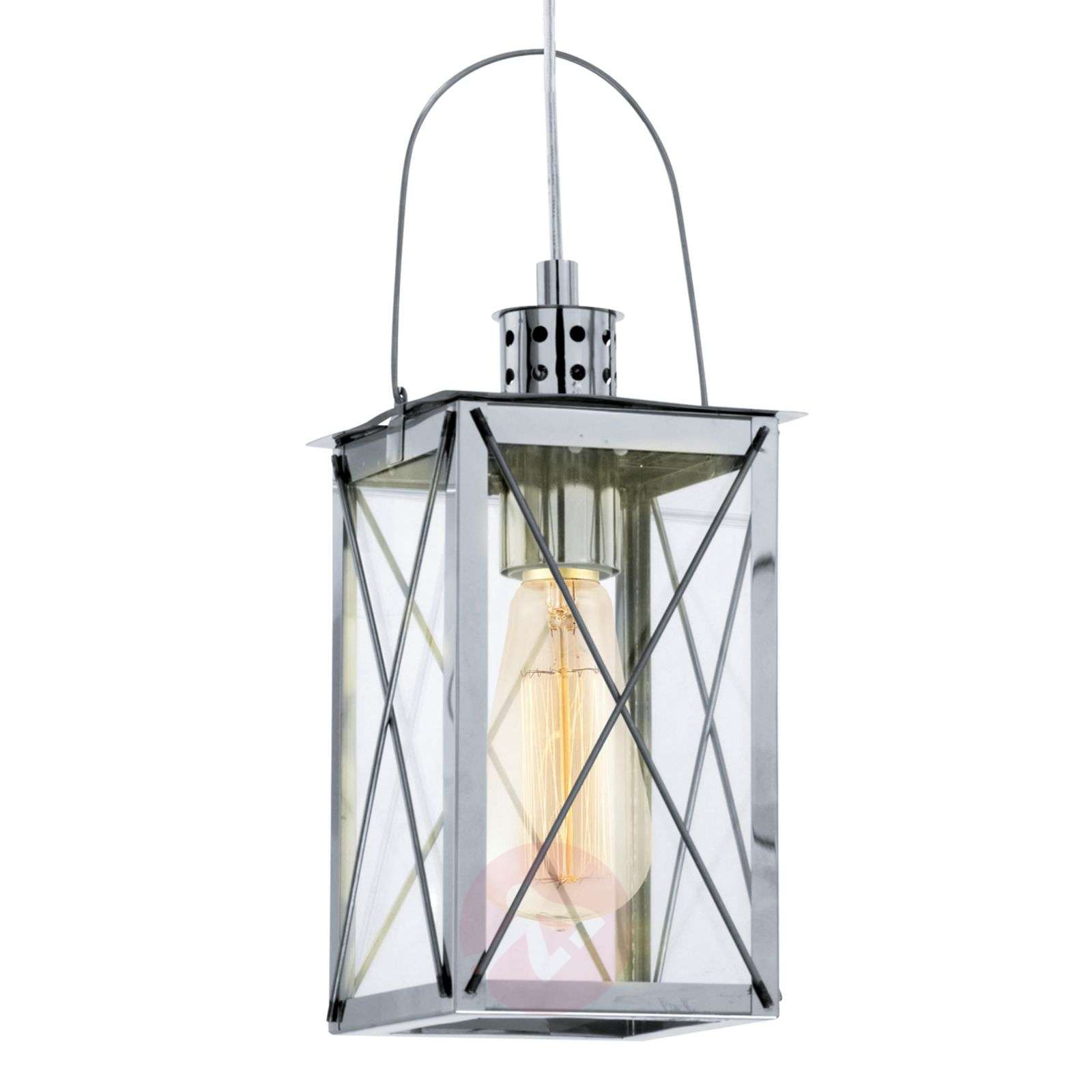 Wisząca lampa-latarenka MARLIA – dekoracja w stylu vintage Ta piękna lampa nadaje się do wnętrz urządzonych w różnych stylach. Jej obudowa została wykonana ze stali pokrytej błyszczącym chromem, a klosz z przezroczystego szkła daje czystą wiązkę światła w całym pomieszczeniu. Klasa efektywności energetycznej: A++