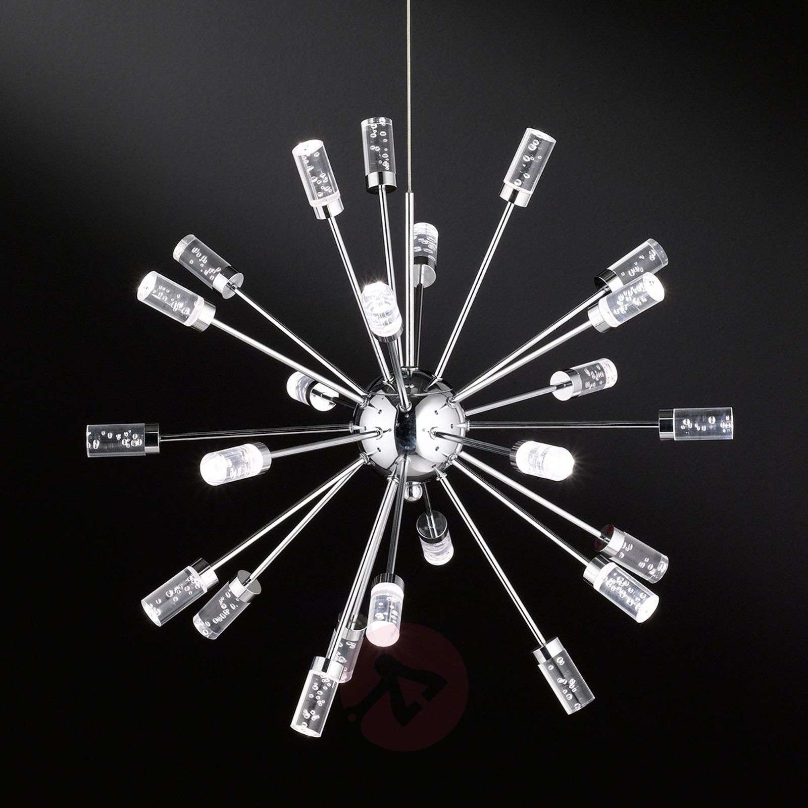 Lampa wisząca LED Cleo z kloszami zdobionymi pęcherzykami Lampa wisząca LED Cleo to atrakcyjna ozdoba każdego pomieszczenia. Składa się z chromowanej podstawy, od której odchodzą we wszystkich kierunkach ramiona z 24 przezroczystymi kloszami ze szkła akrylowego z ozdobnymi pęcherzykami. W każdym z tych kloszy jest zainstalowana dioda LED o mocy 1,5 W, która efektownie podkreśla ozdobne akcenty z pęcherzyków. Energooszczędne oświetlenie i przyjemna atmosfera w pomieszczeniu – lampa wisząca LED Cleo spełnia oba te warunki. Klasa efektywności energetycznej: A+