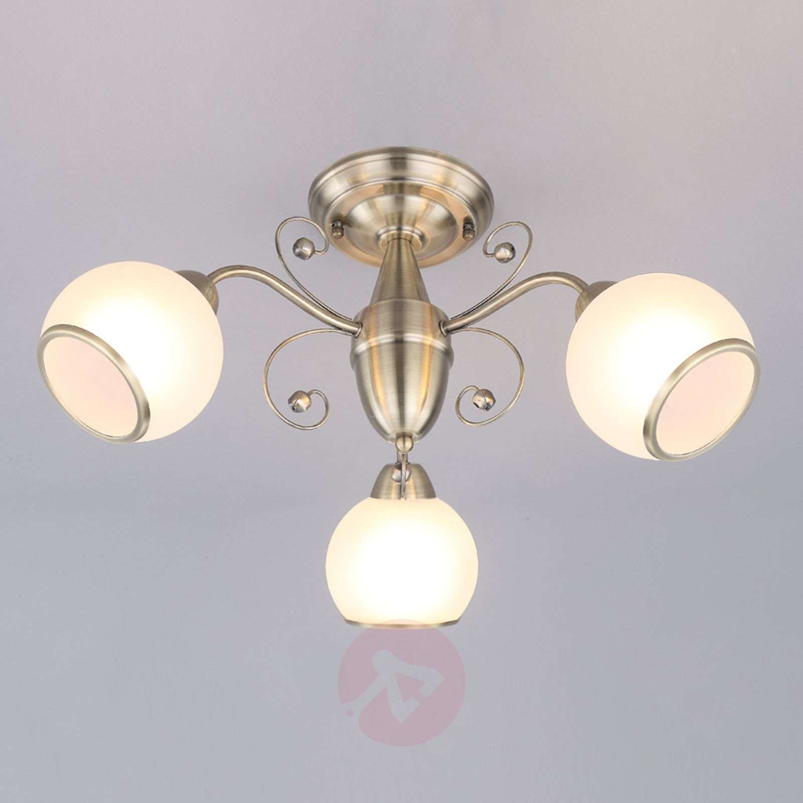 Lampa sufitowa Corentin z trzema kloszami Lampa Corentin utrzymana jest w klasycznym stylu z romantyczną nutą. Szczególnie piękne są metalowe wąsy winorośli, które jak reszta oprawy utrzymane są w kolorze postarzanego mosiądzu. Szklane klosze mają kształt kul, mają jednak z przodu wylot światła uzupełniony o metalowy pierścień. Czyt o w salonie, korytarzu czy sypialni lampa sufitowa Corentin przekonuje wyjątkowym designem oraz równomiernie rozproszonym światłem. Klasa efektywności energetycznej: A++