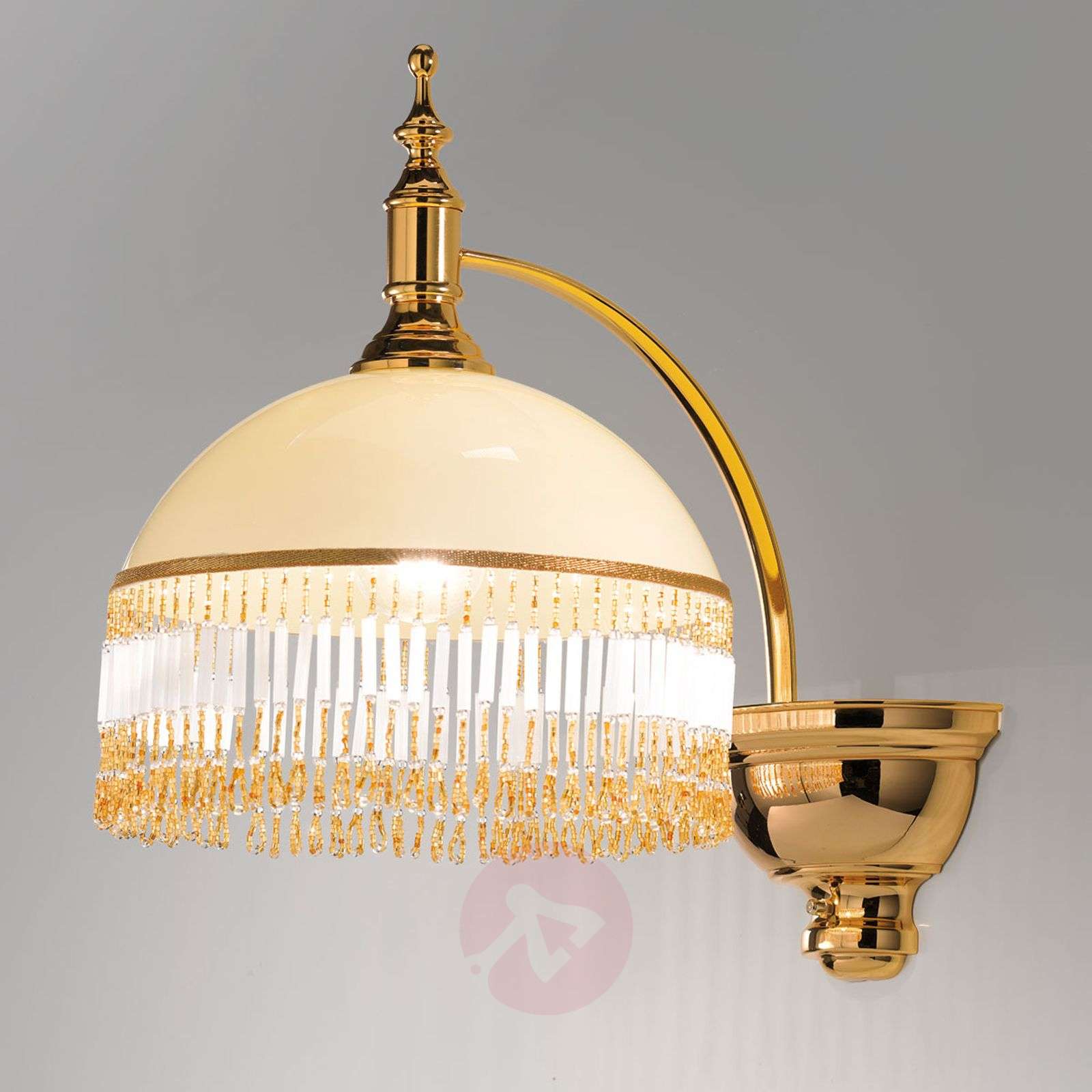 Lampa ścienna Corola o majestatycznym uroku Dzięki kremowemu kloszowi światło włączonej lampy jest szczególnie ciepłe, a piękne wiszące ozdoby w kolorze białym i bursztynowym tworzą piękne refleksy świetlne i perfekcyjnie uzupełniają przepiękny wygląd tej lampy ściennej. To wyrafinowany urok i stylowa przytulność we wnętrzu! Ekskluzywne produkty oświetleniowe tego producenta są produkowane ręcznie wyłącznie we Włoszech, gdzie starannie zwraca się uwagę na wybór wspaniałej jakości stosowanych materiałów. To odpowiada w dużej mierze dążeniu do nawiązywania do długiej tradycji weneckiej sztuki tworzenia oświetlenia oraz do wytwarzania produktów, które powstają z namiętnością i starannością i posiadają niewielkie cechy szczególne, dzięki którym stają się niepowtarzalne i nie do pomylenia. Klasa efektywności energetycznej: A++