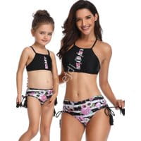Czarne bikini dla mamy i córki z kwiatami i motylkami