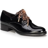 Wiązane półbuty damskie wykonane ręcznie z włoskich skór najwyższej jakości. Czarny model o lakierowanej fakturze to połączenie ponadczasowego koloru z elegancją, jaką daje połyskująca powierzchnia buta. Pazura dodają całości sznurówki z motywem w lamparcie cętki.Nasza rada: klasyczny fason butów na lekko podwyższonym obcasie to gwarancja szyku i komfortu zarazem. wykonane w technologii "hand made" z najlepszych skór; podeszwa wykonana w całości z materiału syntetycznego; przybliżona wysokość obcasa: 3,5 cm; kraj pochodzenia butów:Włochy.