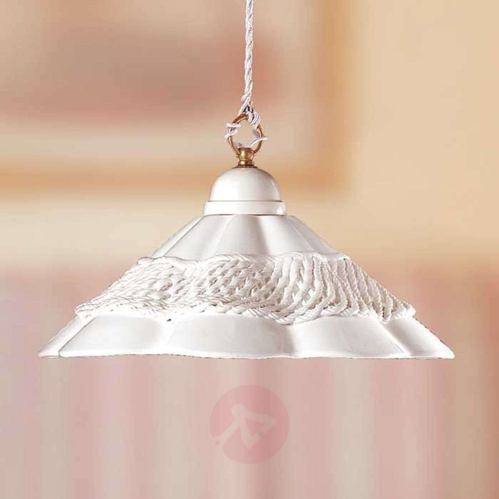 Czarująca lampa wisząca z ceramiki - GONNELLA Ta czarująca lampa wisząca ubogaci pomieszczenia urządzone w stylu romantycznym. Ma biało glazurowany klosz ceramiczny, którego powierzchnia ozdobiona została dekoracyjnym wzorkiem z otworami. Stylistyką przypomina on falującą, koronkową spódnicę i wpisuje się pięknie w romantycznie zaaranżowane wnętrza. Strumień światła lampy, odbijając się od glazurowanej powierzchni klosza pada bezpośrednio w dół. Klasa efektywności energetycznej: A++