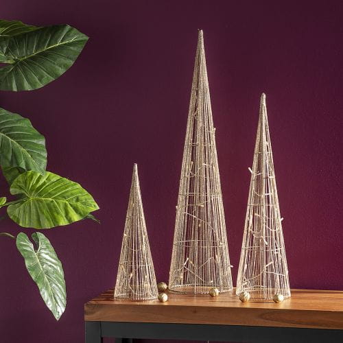Niezwykle oryginalna dekoracja świetlna o kształcie stożkowej choinki, w złotym kolorze.Całość pokryta brokatem.Na choince znajdują się lampki, które po włączeniu subtelnie rozświetlą wnętrze i wniesie blask do pomieszczenia. Doskonale sprawdzi się ustawiona na komodzie, regale czy parapecie.Zasilana na dwie baterie AA(brak w zestawie).