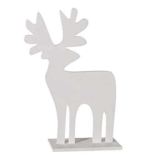 Ręcznie wykonana dekoracja świąteczna w postaci jelonka. Minimalistyczna ozdoba, która przygotuje Twój dom na święta i wniesie do niego wyjątkowy, radosny nastrój. Uniwersalny biały kolor oraz prosta forma pozwalają na wykorzystanie tej dekoracji w wielu stylistykach oraz wnętrzach. Wspaniale zaprezentuje się postawiona na parapecie, kominku, stole, czy komodzie. Możesz ją również wykorzystać do stworzenia włanego świątecznego stroika. Do kompletu polecamy pozostałe dekoracje z tej samej serii. Wymiary: szer. 34cm, gł. 15cm, wys. 50cm. Wymiary podstawy: szer. 15cm, dł. 25cm. Materiał: płyta mdf. Kolor: biały. Waga: 1,1kg.
