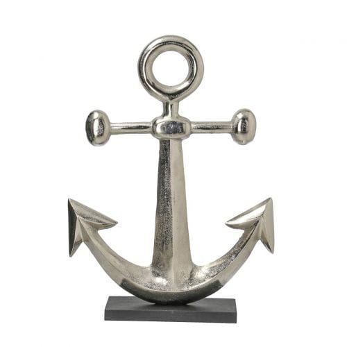 Dekoracyjna kotwica w kolorze srebrnym, na drewnianej podstawie w kolorze czarnym. Wykonana z połyskującego metalu, będzie stanowiła oryginalny i zwracający uwagę dodatek we wnętrzu. Wspaniale zaprezentuje się w towarzystwie innych morskich akcentów. Wymiary: szer. 38,5cm, gł. 10,5cm,wys. 54cm. Materiał: metal/ drewno. Kolor: srebrny/ czarny. Waga: 1,67kg.