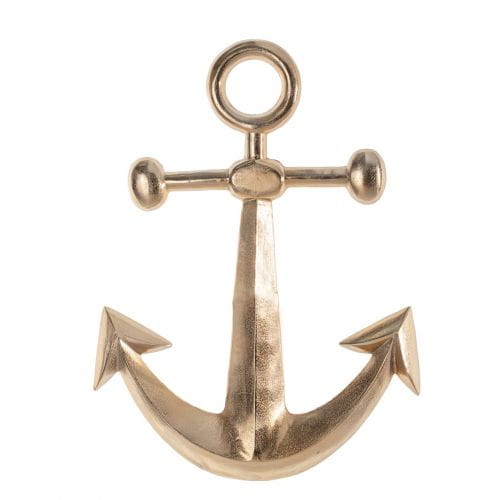 Dekoracyjna, złota kotwica w marynistycznym stylu. Wykonana z elegancko połyskującego metalu. Będzie stanowiła oryginalny i zwracający uwagę dodatek we wnętrzu. Wspaniale zaprezentuje się w towarzystwie innych morskich akcentów lub złotch dekoracji. Wymiary: szer. 61,5cm, gł. 4,5cm, wys. 82,5cm. Materiał: metal. Kolor: złoty. Waga: 2,83kg.