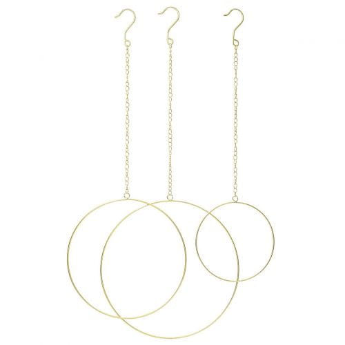 Dekoracja wisząca w kształcie koła, wykonana z metalu w kolorze złotym. Każde koło zawieszone jest na metalowym łańcuszku. Dekoracja daje wiele możliwości zastosowania- koła mogą wisieć same lub udekorowane, np. gałązką lub girlandą. Elegancka i ponadczasowa dekoracja salonu, jadalni czy sypialni. W zestawie wystepują kółka na łańcuszku bez dekoracji. Wymiary: kółko małe- śr. 20cm, dł. 68cm; kółko średnie- śr. 30cm, dł. 77,5cm; kółko duże- śr. 35cm, dł. 83cm.
