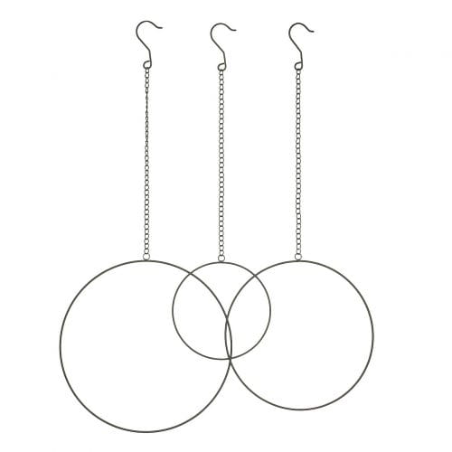 Dekoracja wisząca wykonana z metalu w kolorze czarnym. Każde koło zawieszone jest na metalowym łańcuszku. Dekoracja daje wiele możliwości zastosowania- koła mogą wisieć same lub udekorowane, np. gałązką lub girlandą. Elegancka i ponadczasowa dekoracja salonu, jadalni czy sypialni. W zestawie wystepują 3 kółka różnej wielkości na łańcuszku (bez dekoracji). Wymiary: kółko małe- śr. 20cm, kółko średnie- śr. 30cm, kółko duże- śr. 35cm, dł. łańcuszka 48cm.