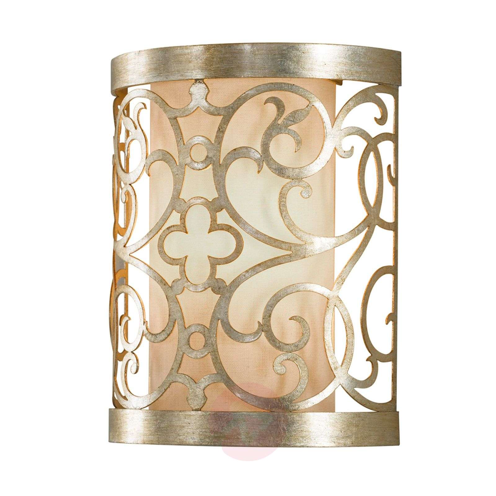 Romantyczna lampa ścienna ARABESQUE z kunsztownym ornamentem i lnianym abażurem Lampę ścienną ARABESQUE zdobią kunsztownie wykonane spiralne ornamenty, które nadają jej romantyczny charakter. Metalowa oprawa jest wykonana patynowanym srebrem płatkowym i w połączeniu z jasnym lnianym abażurem tworzy elegancką, cieszącą oko kompozycję, która najlepiej prezentować się będzie w klasycznie urządzonych wnętrzach,ale również i w nowoczesnych pomieszczeniach. Klasa efektywności energetycznej: A++