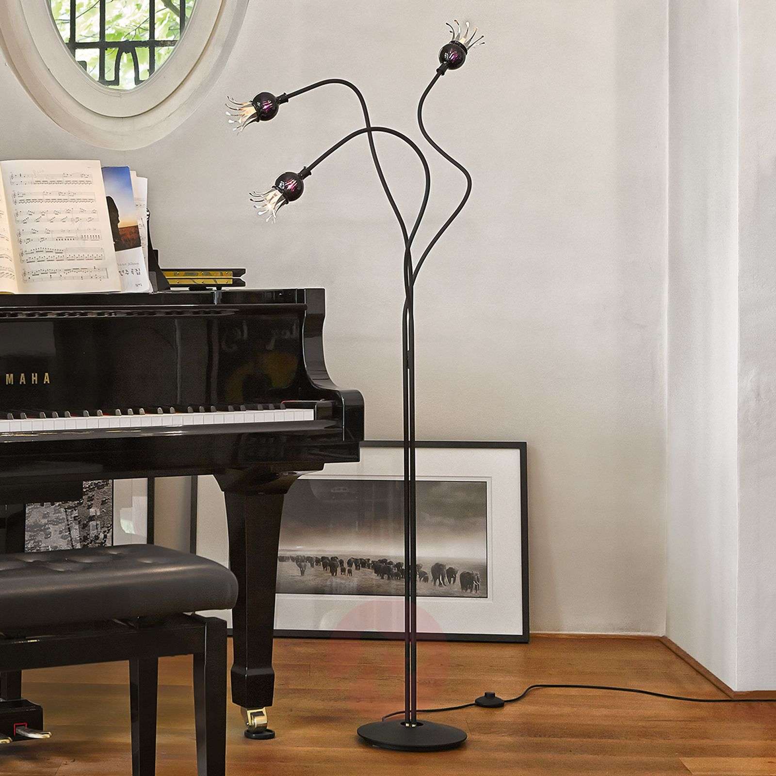 Poppy - designerska lampa stojąca z przecudnymi płatkami kwiatów Ramiona Poppy, tej niezwykłej designerskiej lampy stojącej, wydają się wyginać we wszystkich możliwych kierunkach, a także obracać. Jedno ramię skierowane jest do dołu, drugie zaś do góry, a trzecie obraca się w bok, ku tyłowi. Mogą się one krzyżować, oddalać od siebie lub prowadzić niemal własne życie. Ten efekt jest dokładnie tym, co chcieli osiągnąć projektanci tej lampy stojącej. Poppy została zaprojektowana tak, aby zapewnić możliwie największą elastyczność, dlatego też zamiast sztywnej podstawy ma ona trzy elastyczne ramiona, które można obracać w dowolnych kierunkach. Fakt, że pokryte tekstylną powłoką ramiona lampy i metalowa podstawa są czarne, sprawia, że wyglądają one bardzo wyraźnie, a ich kształt odróżnia się na tle całości lampy. Naprawdę wyjątkowa cecha tej oprawy kryje się nie w ramionach elastycznych, które często znajdują się w lampach stołowych czy stojących, ale w małych kloszach, przypominających kwiaty. Środki tych filigranowych kwiatów tworzą kule z dmuchanego szkła w kolorze czarno-fioletowym, które skrywają także trzy żarówki. Kiedy załączymy światło, przeniknie ono przez tę nietypową strukturę szkła, a fiolet uwidoczni się w bardzo piękny sposób. Wydarzy się także jednak jeszcze coś ciekawego: Płatki kwiatów same się otworzą! To nie żadne czary, lecz po prostu zjawisko fizyczne, które sprawia, że te płatki kwiatów się rozwijają. Płatki tych kwiatów, wykonane z bimetalu, reagują na ciepło żarówki i powoli się rozszerzają. Dzięki temu uzyskujemy efekt naśladowania naturalnego widowiska, do którego uzyskania wykorzystano najprostszą technologię, łącząc ją w inteligentny sposób z obsługą światłą tak, że powstaje element oświetleniowy, którego jeszcze nie było: Poppy! Klasa efektywności energetycznej: C