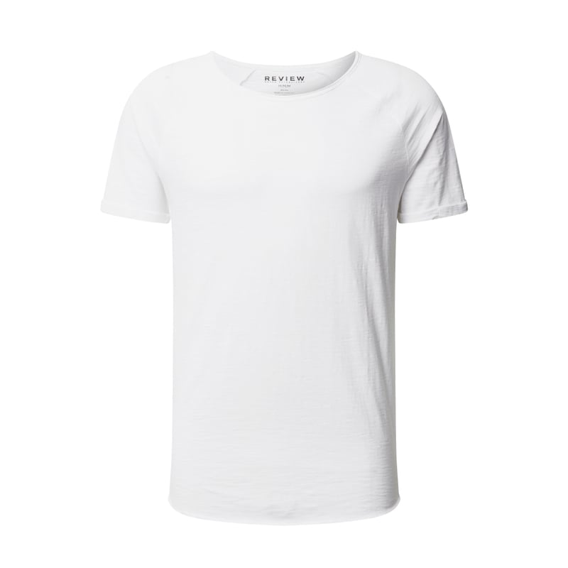 Długa koszulka męska Review, Czysta bawełna, Dżersej slub, Krój longer fit, Okrągły dekolt bez wykończenia, Krótkie rękawy raglanowe z przeszytą zakładką, Zaokrąglony dół, Długość tyłu w rozmiarze L: 85 cm