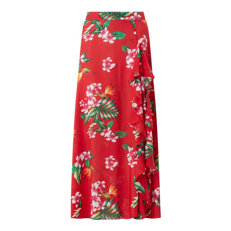 Długa spódnica damska GUESS , Czysty modal , Krój rozkloszowany , Kwiatowy wzór , Falbana , Kryty zamek błyskawiczny z boku, Długość całkowita w rozmiarze S: 99 cm, Szerokość w pasie w rozmiarze S: 70 cm