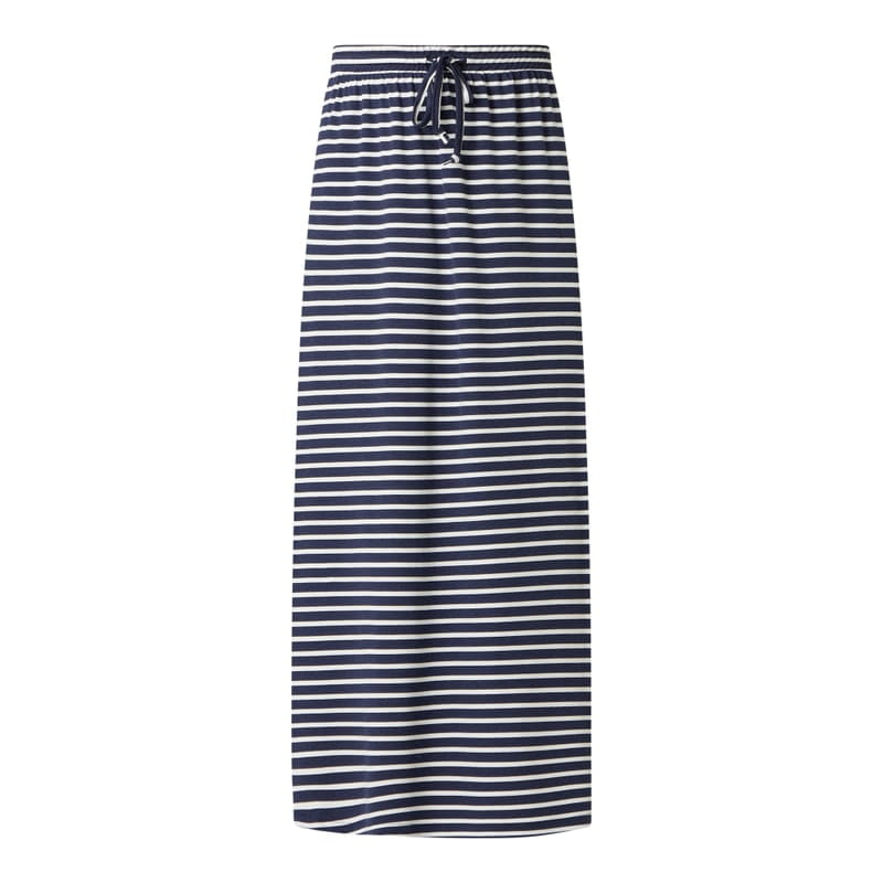 Długa spódnica damska VILA , Mieszanka wiskozy i elastanu , Lekko rozkloszowany krój , Wzór w paski , Elastyczny pas z tunelem , Wysokie rozcięcia po bokach , Długość całkowita w rozmiarze S: 95 cm