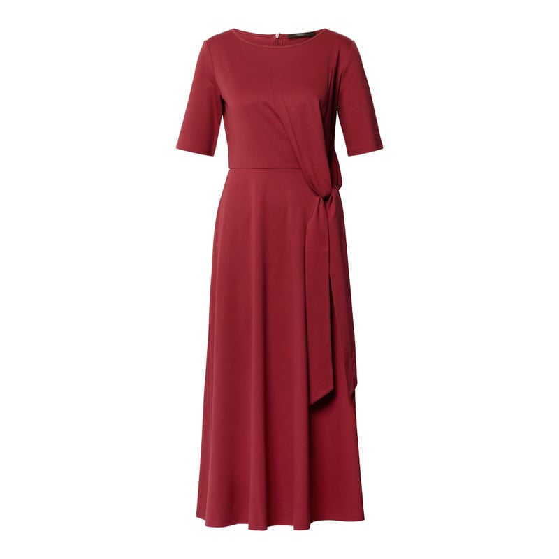 Długa sukienka damska Weekend Max Mara, Wytrzymały materiał, Zaznaczona talia, Z krótkim rękawem, Okrągły dekolt, Przyszyte wiązanie, Zamek błyskawiczny z tyłu, Długość tyłu w rozmiarze S: 122 cm, Szerokość klatki piersiowej w rozmiarze S: 41 cm, Długość rękawa w rozmiarze S: 28 cm