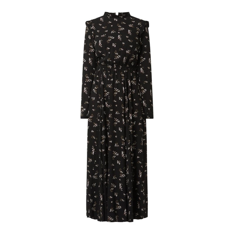 Długa sukienka damska REVIEW , Czysta wiskoza , Taliowany krój, Kwiatowy wzór , Stójka z falbaną , Długie rękawy z falbanami na ramionach , Rozkloszowana spódnica , Długość tyłu w rozmiarze S: 141 cm, Długość rękawa w rozmiarze S: 65 cm