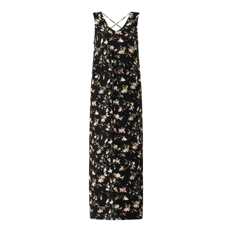 Długa sukienka damska VERO MODA, Czysta wiskoza, Lekko rozkloszowany krój, Zwierzęcy nadruk, Dekolt w serek, Tunel w talii, Skrzyżowane paski z tyłu, Długość tyłu w rozmiarze S: 136 cm