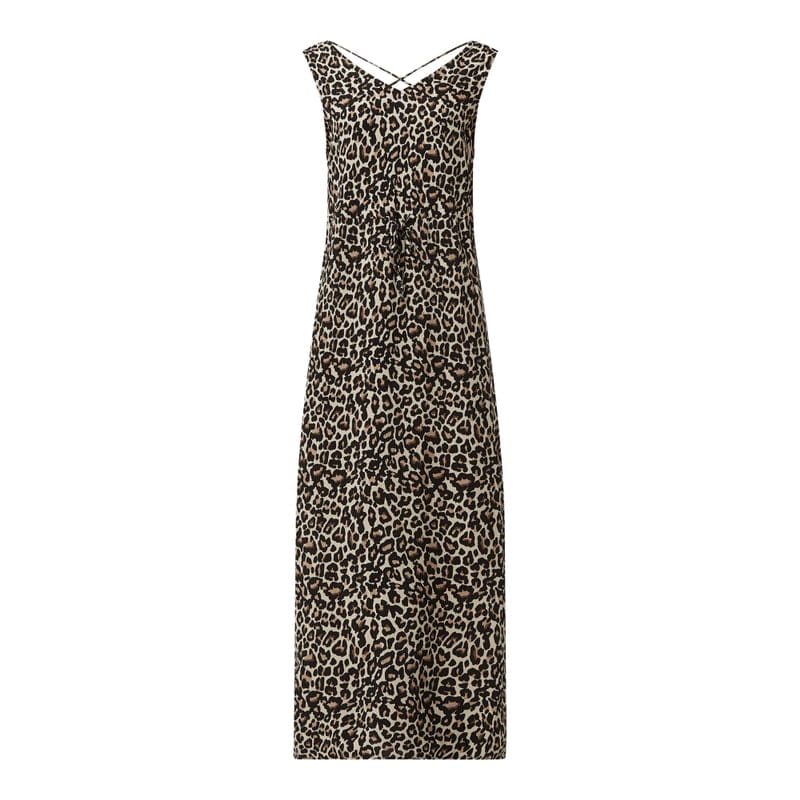 Długa sukienka damska VERO MODA, Czysta wiskoza, Lekko rozkloszowany krój, Zwierzęcy nadruk, Dekolt w serek, Tunel w talii, Skrzyżowane paski z tyłu, Długość tyłu w rozmiarze S: 136 cm