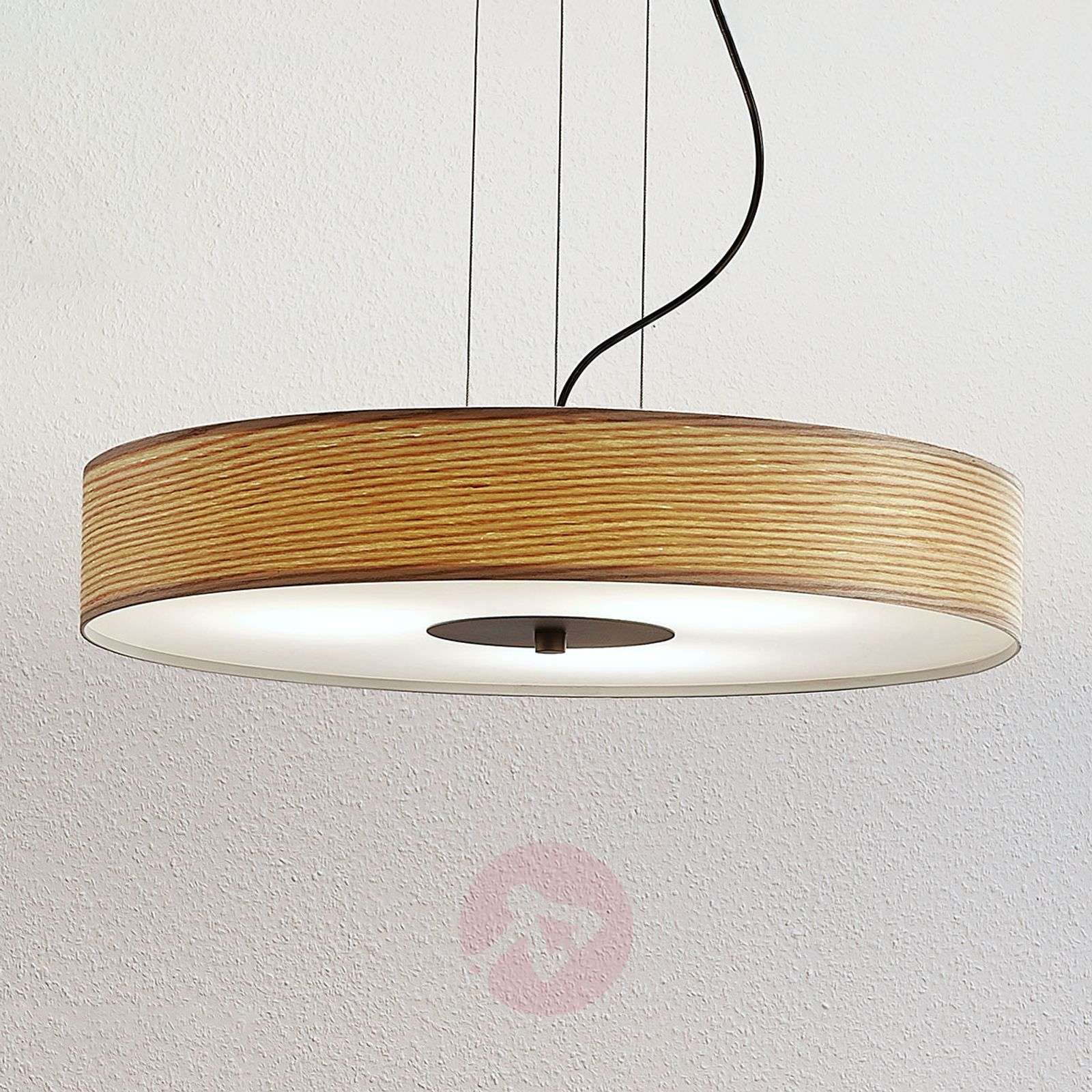 Naturalnie wyglądająca lampa wisząca Dominic z atrakcyjnym drewnianym kloszem i białym dyfuzorem na spodzie wykonanym z białego tworzywa sztucznego Dominic to okrągła lampa wisząca, która charakteryzuje się przede wszystkim płaskim, cylindrycznym drewnianym kloszem. Drewno tutaj zostało doprowadzone do bardzo cienkiej, półprzezroczystej grubości materiału, dzięki czemu po włączeniu pięknie prezentują się słoje jasnego klosza, co potęguje przytulny nastrój tworzony przez tę lampę. Na spodzie klosza znajduje się biały dyfuzor z tworzywa sztucznego, dzięki czemu można zagwarantować bardzo miękki, przytulny promień światła, który doskonale nadaje się do oświetlenia mieszkania. Drewniana lampa wisząca doskonale sprawdzi się na przykład przy oświetlaniu stołów w jadalni, gdzie trzy oprawy oświetleniowe zapewnią wystarczającą jasność. Klasa efektywności energetycznej: A++