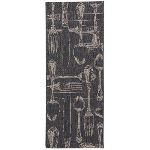 Dywan Cottage Cutlery w ciemnej kolorystyce. Kolekcja dywanów Cottage wykonana jest z polipropropylenu, są wytrzymałe i łatwe w czyszczeniu. Dodatkowo polipropylen jest materiałem syntetycznym co sprawia, że dywany Cottage są antyalergiczne i antystatyczne. Dywany wykonane z polipropylenu są odporne na ścieranie i dobrze utrzymują ciepło. Stonowana kolorystyka oraz ciekawy "kulinarny" nadruk sprawią, że dywan ten będzie praktyczną ozdobą każdej kuchni.Wyprodukowany w Belgii.Wymiar: 60x180cm. Skład: 100% polipropylen, efekt włókien sizalu. Instrukcja czyszczenia: odkurzać regularnie, plamy natychmiast usuwać mokrą gąbką, polecane jest profesjonalne czyszczenie na sucho.Poradnik zakupowy - jak wybrać najlepszy dywan do mieszkania: http://www.dekoria.pl/blog/jak-wybrac-najlepszy-dywan-do-mieszkania/