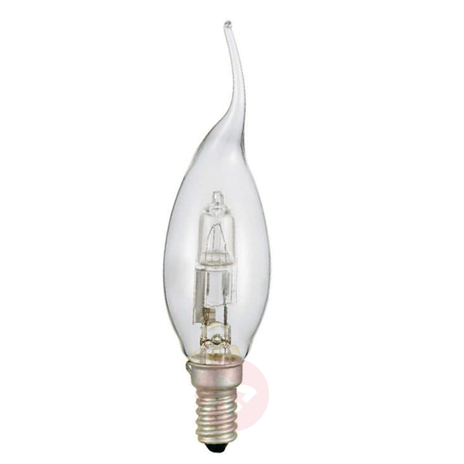 Żarówka halogenowa płomyk E14 Ta żarówka halogenowa w kształcie płomyka to energooszczędna wersja tradycyjnej żarówki w kształcie płomyka i doskonale nadaje się do żyrandoli lub klasycznych/rustykalnych lamp ściennych. Przekonuje wyjątkowo ciepłym światłem i dodatkowo posiada bezstopniową funkcję ściemniania. Klasa efektywności energetycznej: C