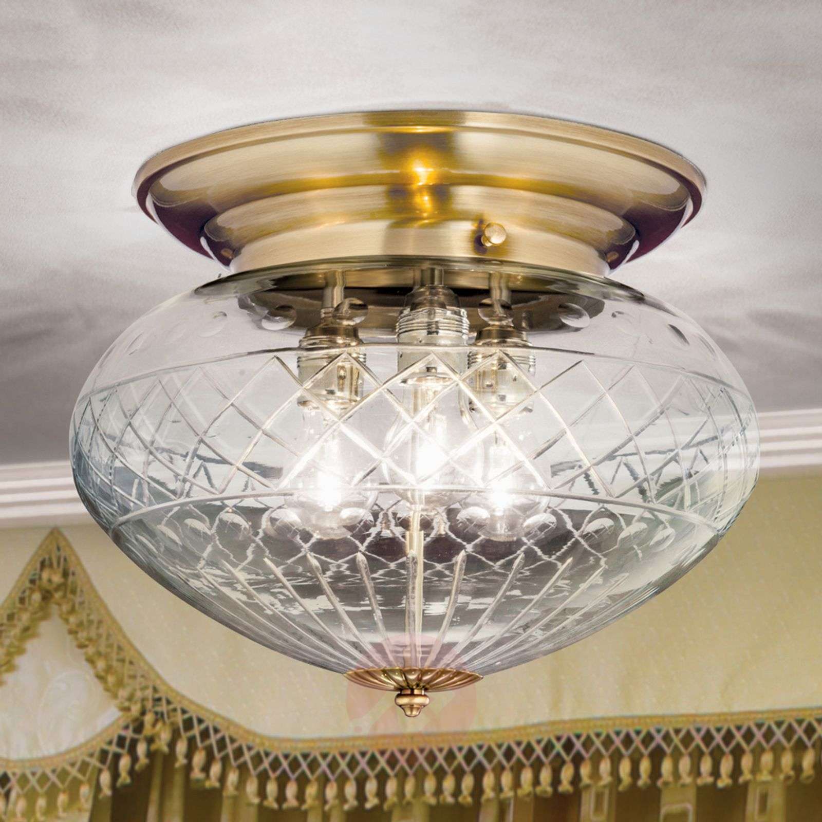 Brązowana lampa sufitowa ENNA z ręcznie szlifowanym kloszem z przezroczystego szkła Przezroczyste szkło o ładnej strukturze, zdobione diamentowym szlifem oraz brązowana powierzchnia to elementy decydujące o stylu tej szlachetnej lampy sufitowej, która będzie pasowała do wszystkich mieszkań i domów urządzonych w stylu klasycznym. Baldachim w kolorze brązu przydaje lampie ENNA atrakcyjności i jest ekskluzywnym akcentem stylistycznym. Lampy te spełniają najwyższe wymagania w zakresie wysokiej jakości, elegancji i trwałości. Tutaj połączenie kreatywności projektantów i austriackiej sztuki rzemieślniczej pozwala na stworzenie produktów, znajdujących uznanie na arenie międzynarodowej. Od roku 1948 lampy tego producenta są wytwarzane w 100 % w Austrii, co gwarantuje dostępność części zamiennych przez długie lata. Na zapytanie dostępna także w innych rozmiarach i wykończeniach powierzchni. Klasa efektywności energetycznej: A++