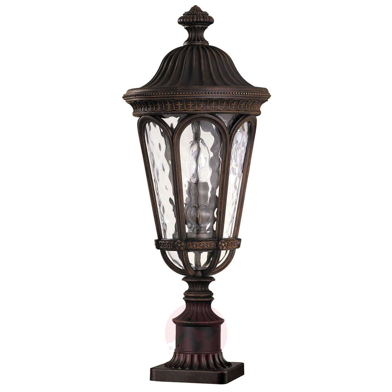 Okazała lampa cokołowa Regent Court Lampa Regent Court w stylu regencyjnym jest wykonana z wytrzymałego odlewu aluminiowego, a klosz z przezroczystego dmuchanego szkła ma charakterystyczną falistą strukturę, która nadaje emitowanemu światłu nieco bardziej nastrojowy wymiar. Epoka w historii sztuki w Wielkiej Brytanii, zwana regencyjną trwała od 1783 do 1834 roku i charakteryzowała się wprowadzeniem nowych materiałów, takich jak żeliwo. Lampa cokołowa Regency Court odzwierciedla wytrzymałość materiału i może na przykład pełnić rolę okazałego elementu, wyznaczającego granice posesji. - szklany klosz wykonany ręcznie Klasa efektywności energetycznej: A++