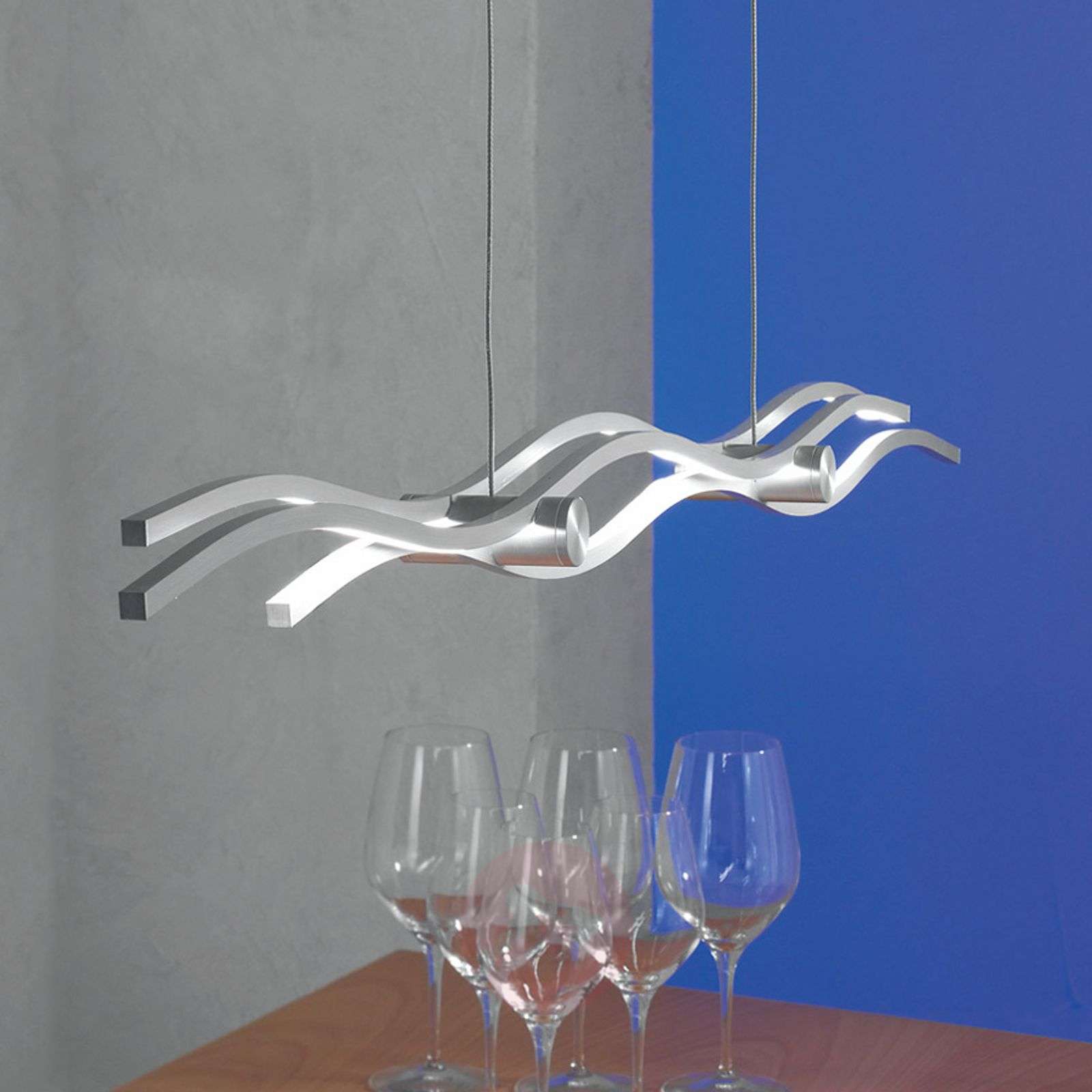 Wyjątkowa: lampa wisząca LED Silk Ta lampa wisząca łączy w sobie ekscytujący design z wysoką wartością użytkową. Lampa kryje w swej falistej aluminiowej konstrukcji coś naturalnego, a jednocześnie zachwyca otoczenie nowoczesnym charakterem. Lampa wisząca o nowoczesnym designie Ta lampa wisząca pochodzi z firmy Escale i jest synonimem perfekcjonistycznego designu. Made in Germany. Lampa jest subtelna, ale dzięki zabawnemu designowi nie da się jej zapomnieć i z pewnością przyciąga wzrok obserwatora w każdym mieszkaniu. Oszczędność energii dzięki diodom LED Lampa jest wyposażona w diody LED, dzięki czemu jest szczególnie energooszczędna. Światło o barwie ciepłej bieli można przełączać oddzielnie za pomocą przełącznika przyciskowego umieszczonego na środkowej belce. Lampę Silk można przyciemnić za pomocą ściemniacza zewnętrznego. Klasa efektywności energetycznej: A+