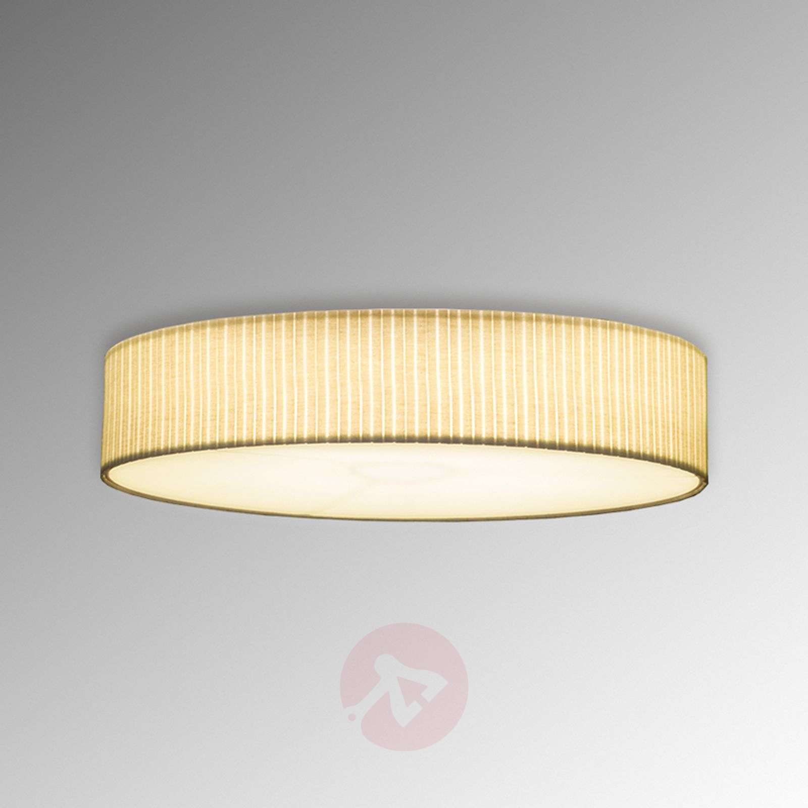 Okrągła lampa sufitowa Onda z plisowanej tkaniny Nowoczesna lampa sufitowa Onda posiada duży abażur o klasycznym okrągłym kształcie. Wysokiej jakości tkanina abażuru została kunsztownie ułożona w fałdy, dlatego posiada drobno pofałdowaną powierzchnię prezentującą się bardzo stylowo. Ciekawy odcień naturalnej bieli nie tylko nadaje lampie elegancki charakter, lecz również tworzy doskonałe i wyjątkowo harmonijne światło. Ze względu na płaską formę lampa sufitowa Onda nie zaburza istniejącego stylu wystroju i doskonale się w niego wpasowuje. Lampa jest dostępna w trzech rozmiarach. Osłona jest utrzymana w kolorze abażuru. Klasa efektywności energetycznej: A++