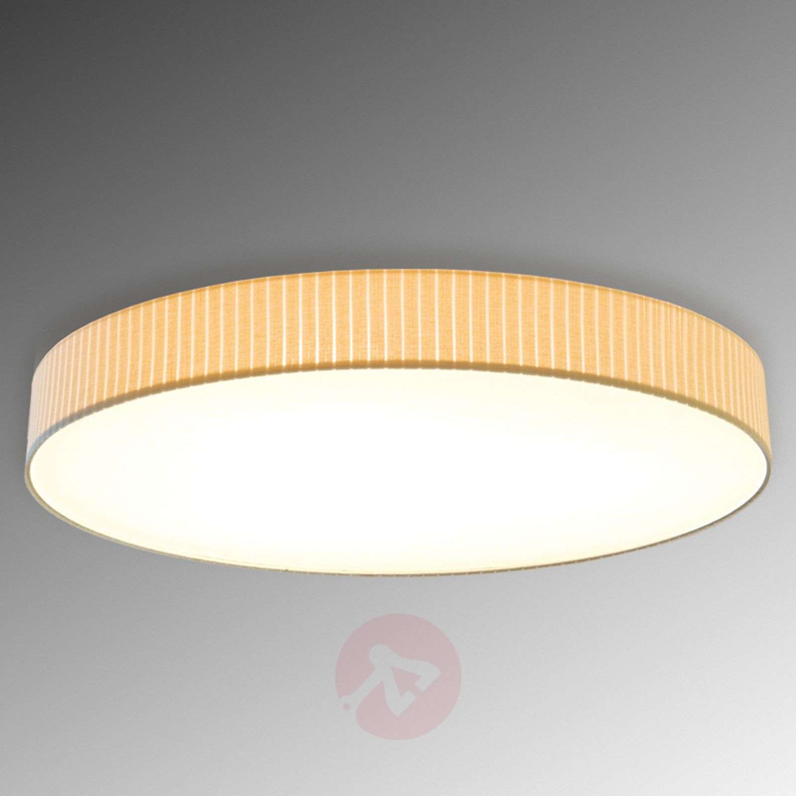 Okrągła lampa sufitowa Onda z plisowanej tkaniny Nowoczesna lampa sufitowa Onda posiada duży abażur o klasycznym okrągłym kształcie. Wysokiej jakości tkanina abażuru została kunsztownie ułożona w fałdy, dlatego posiada drobno pofałdowaną powierzchnię prezentującą się bardzo stylowo. Ciekawy odcień naturalnej bieli nie tylko nadaje lampie elegancki charakter, lecz również tworzy doskonałe i wyjątkowo harmonijne światło. Ze względu na płaską formę lampa sufitowa Onda nie zaburza istniejącego stylu wystroju i doskonale się w niego wpasowuje. Lampa jest dostępna w trzech rozmiarach. Osłona jest utrzymana w kolorze abażuru. Klasa efektywności energetycznej: A++