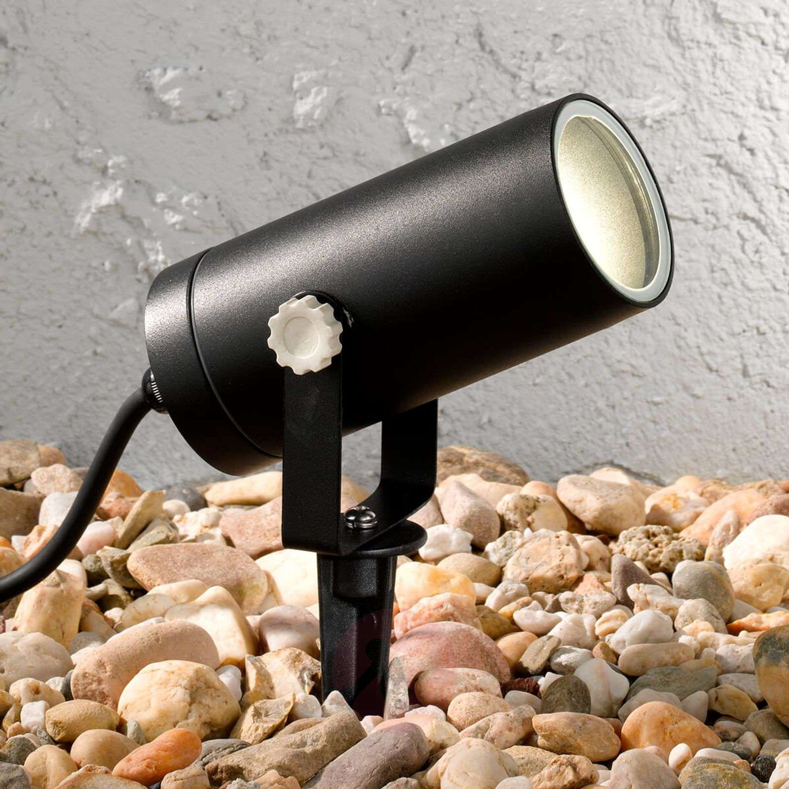 Dyskretny reflektor LED Farold z grotem ziemnym i ruchomą głowicą Reflektor z grotem ziemnym LED jest idealnym oświetleniem eksponującym konkretny obszar na zewnątrz. Wystarczy wetknąć go w ziemię obok oświetlanego obiektu lub przed nim i odpowiednio nakierować głowicę, tak by optymalnie oświetlała wybrany obszar. Dzięki czarnej powłoce reflektor dyskretnie wpisuje się w otoczenie również za dnia. Klasa efektywności energetycznej: A++