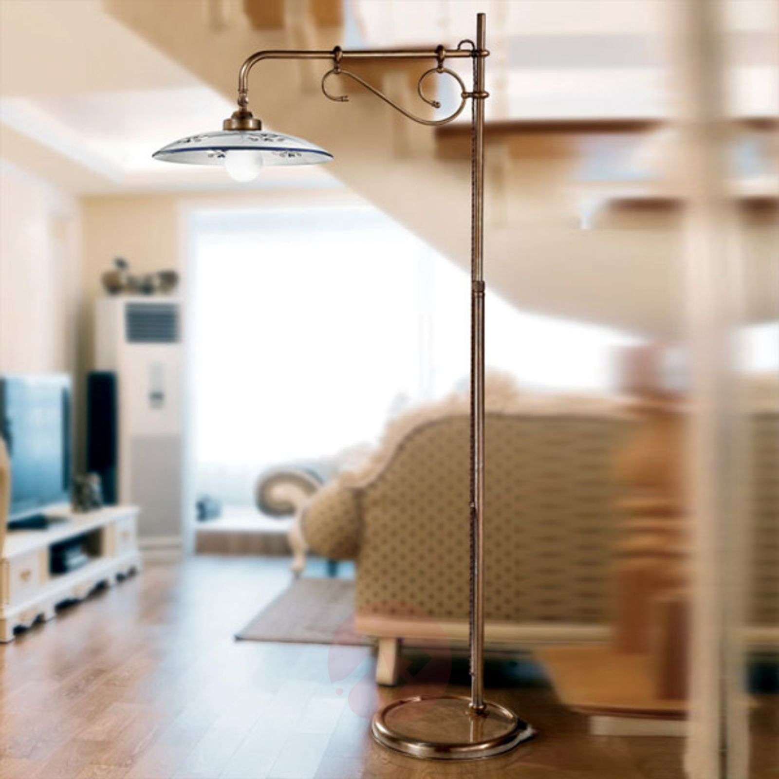 Mosiężna lampa stojąca BASSANO z wychylnym, ceramicznym kloszem Tradycyjne, włoskie wzornictwo oraz nowoczesne techniki produkcji składają się na dekoracyjny wygląd lampy stojącej BASSANO. Lampa BASSANO posiada ładną, mosiężną strukturę z regulacją wysokości i jest wyposażona w pięknie zdobiony, ceramiczny klosz. Klosz można indywidualnie ustawiać, dopasowując oświetlenie do potrzeb. Ceramiczny klosz jest dostępny z dekoracjami w kolorze brązowym, niebieskim i zielonym. Klasa efektywności energetycznej: A++