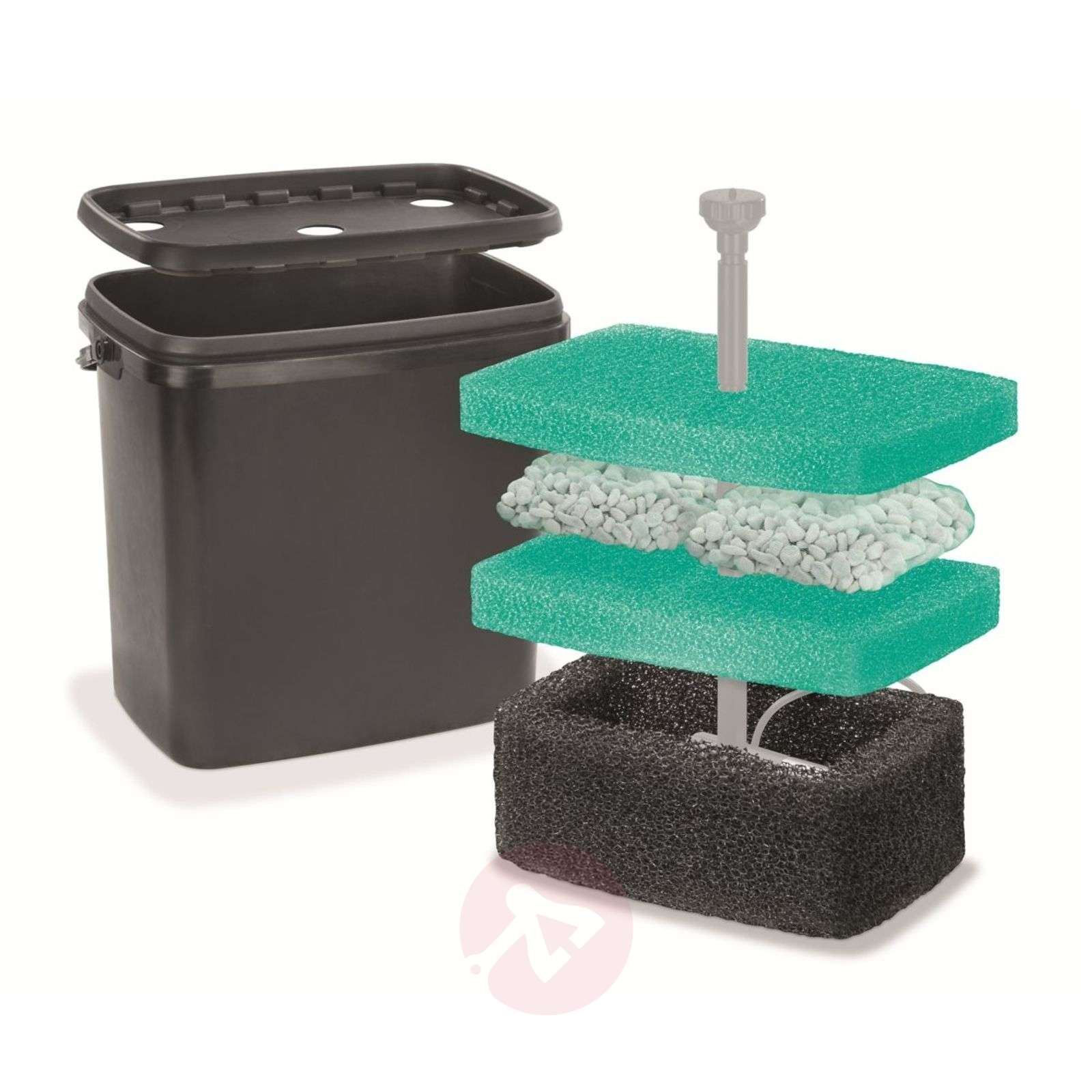 Zestaw filtrów do oczek wodnych do systemu pomp Napoli" oraz "Siena" Zestaw filtrów można stosować razem z solarnym zestawem pomp do oczek wodnych "Napoli" i "Siena”. W czasie pracy pompy, woda spływa do niej z góry przez pojedyncze gąbki filtra lub siatki z kamieniami. Przefiltrowana woda wpada z powrotem do oczka przez tryskacz. Dostawa nie obejmuje pompy! Dane techniczne: - Składa się z zestawu filtrów z uchwytem i pokrywą - 3 gąbki filtra i 2 worki siatkowe bez materiału filtrującego - Wymiary (dł x sz x wys): 29 x 21 x 26,5 cm - Głębokość wody: min. 35 cm (przy głębszych oczkach filtr umieścić na kamieniu) Uwaga: Chronić pompę i filtr przed mrozem i nie używać zimą! "
