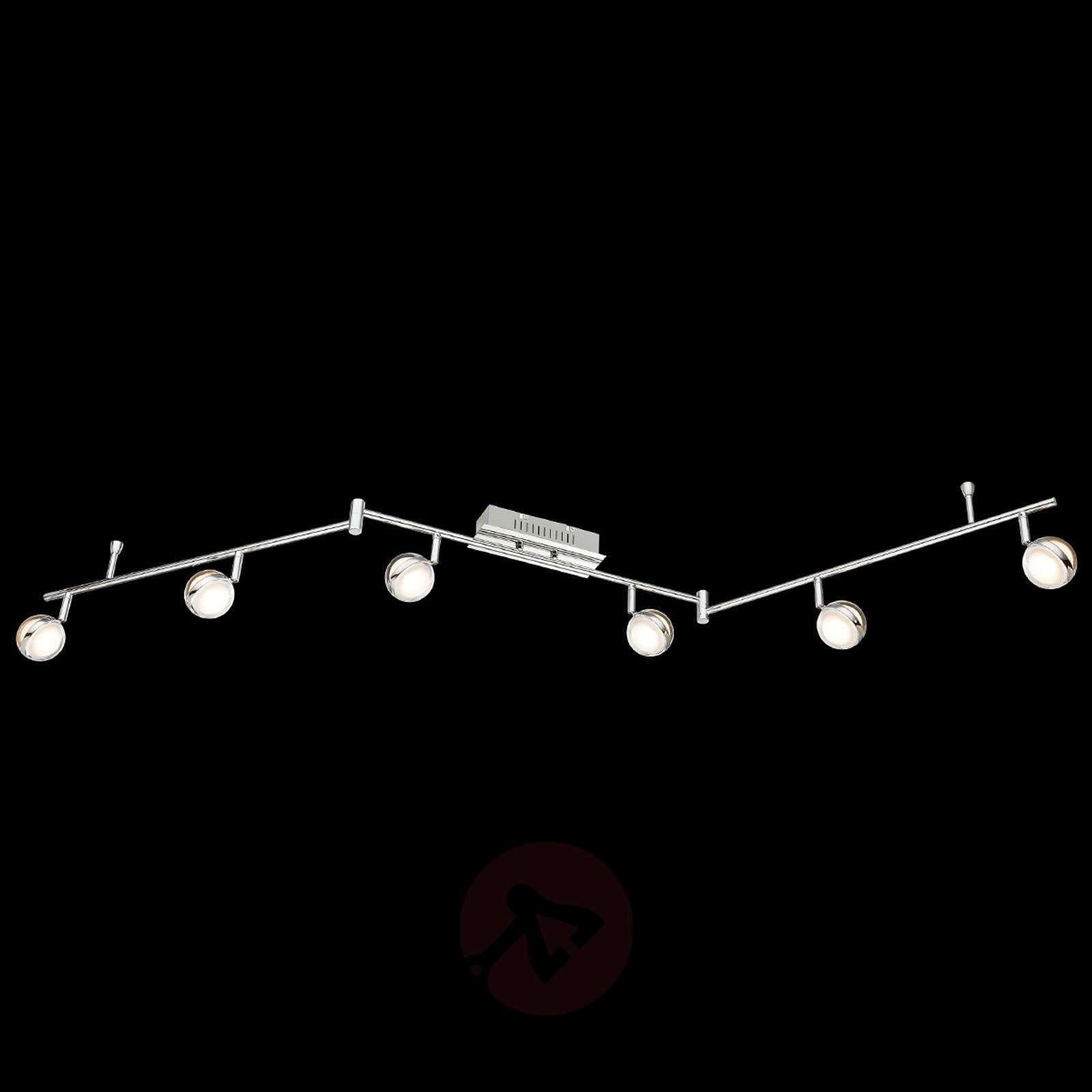 6-punktowa lampa sufitowa LED Fulton z przezroczystymi kulami akrylowymi Długa na 177 cm 6-punktowa lampa sufitowa LED Fulton optymalnie oświetli nawet duże pomieszczenia. W trzyczęściowej podstawie z chromowanego metalu dwa boczne wysięgniki są ruchome i można je ustawiać pod dowolnym kątem do środkowego stelaża. W rozmieszczonych na podstawie przezroczystych kulistych kloszach akrylowych o satynowanej powierzchni wewnętrznej zainstalowane są bardzo energooszczędne diody LED, emitujące przyjemne światło o barwie ciepłej bieli. Klasa efektywności energetycznej: A+