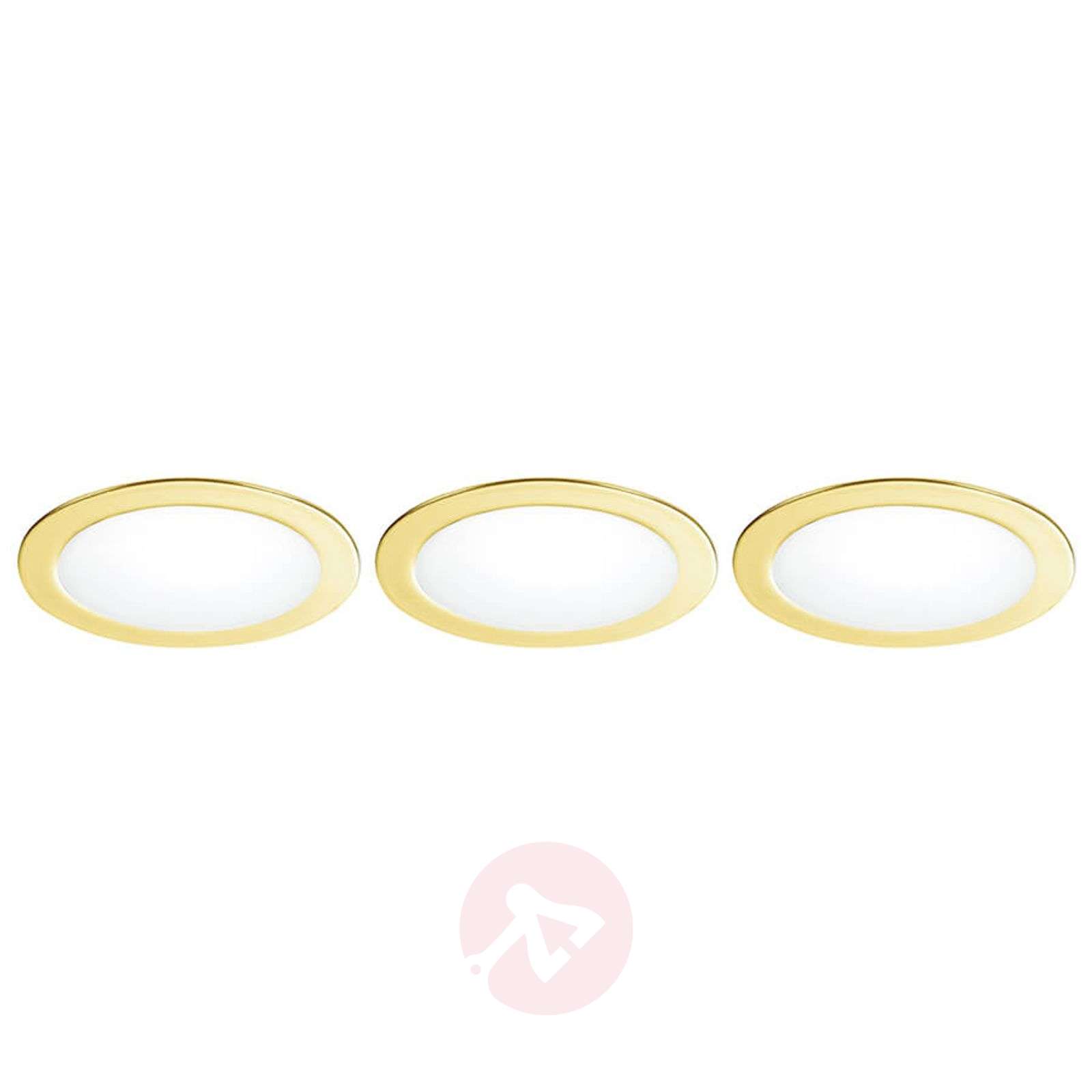 Sufitowa oprawa wpuszczana LED Fusion w kolorze złotym, w zestawie 3 sztuk Pomalowana na złoto aluminiowa rama nadaje sufitowej oprawie wpuszczanej Fusion elegancki wygląd, wyróżniający ją na tle sufitu korytarzy, salonów i sypialni. Szeroki kąt wiązki 120° oraz satynowana pokrywa gwarantują przyjemne i równomierne promieniowanie światła i przyjemną atmosferę. Oprawa wpuszczana LED promienieje barwą światła w odcieniu uniwersalnej bieli (4 000 kelwinów). Dostarczana jest w zestawie trzech sztuk wraz ze sterownikami LED. Klasa efektywności energetycznej: A+